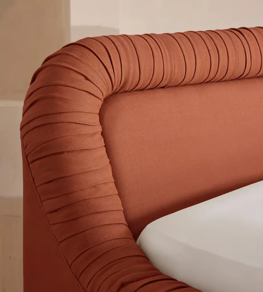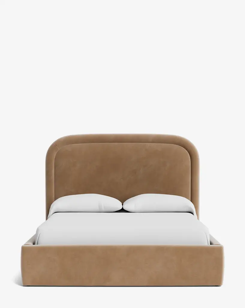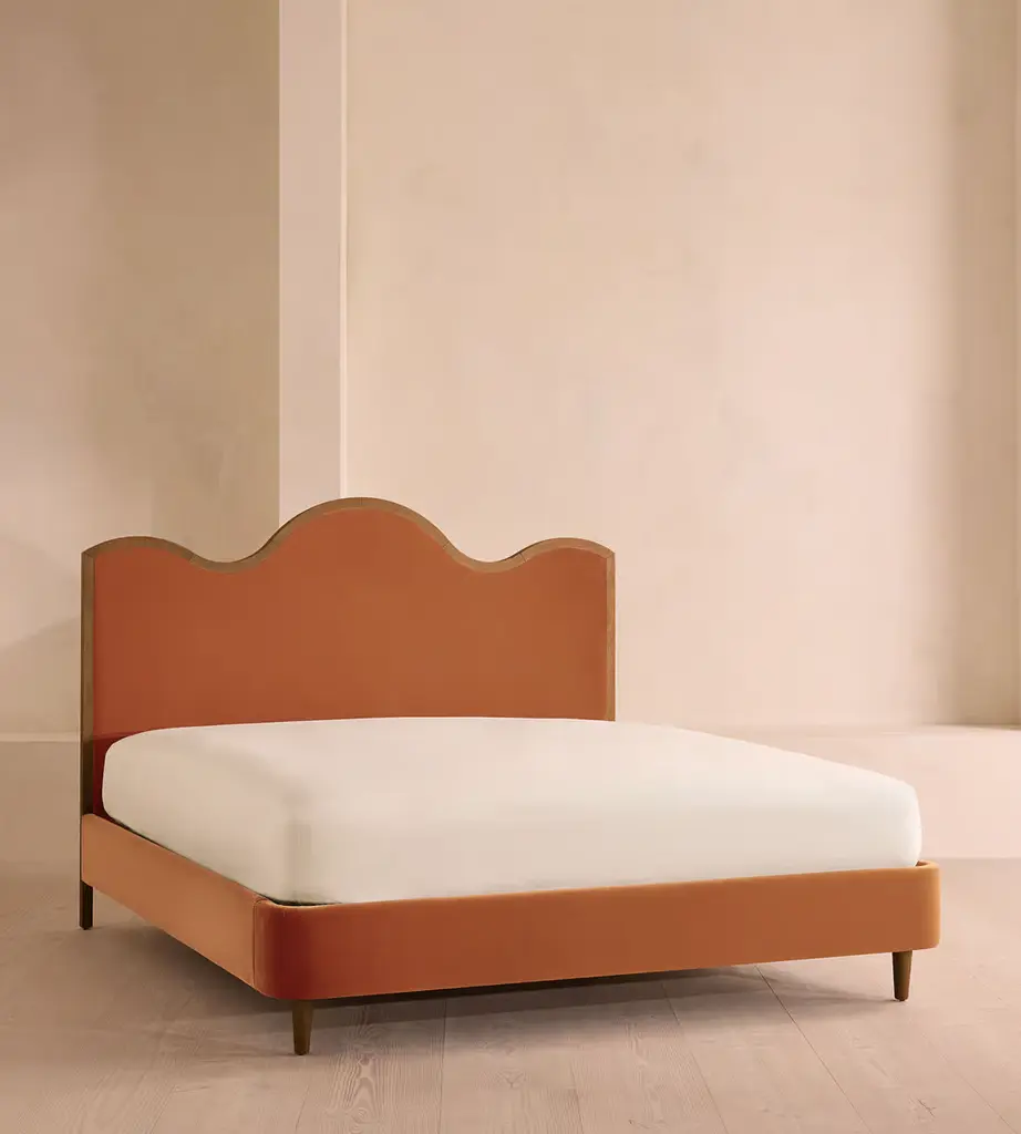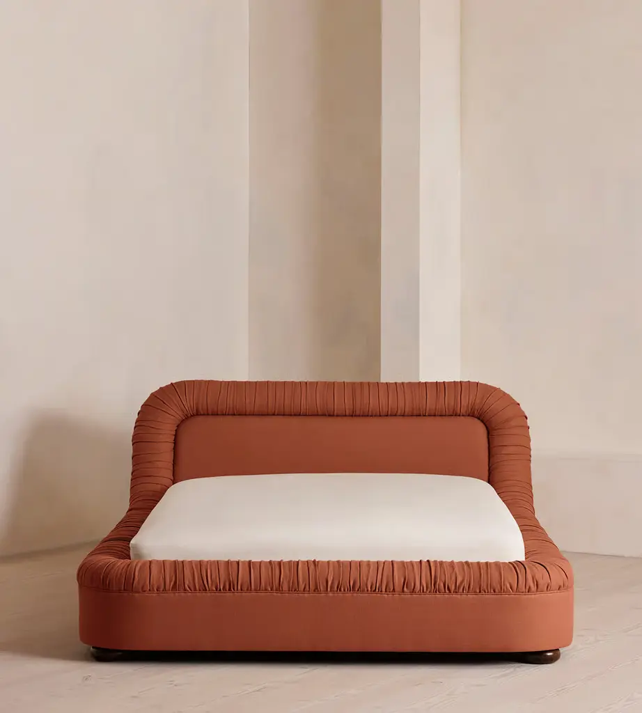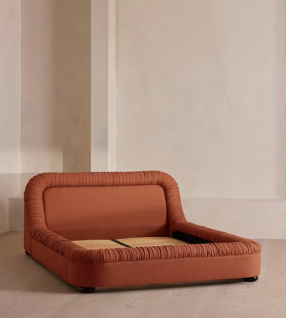 A relaxed profile that sits low to the floor showcases a mix of upholstery techniques, from a cushioned, sloped headboard to the ruched border that wraps around the frame. Finished with a low, cushioned headboard, the Vara bed's silhouette is made to mirror the aesthetic of Soho House Rome. It comes fully upholstered in velvet or linen that's ruched around the border.