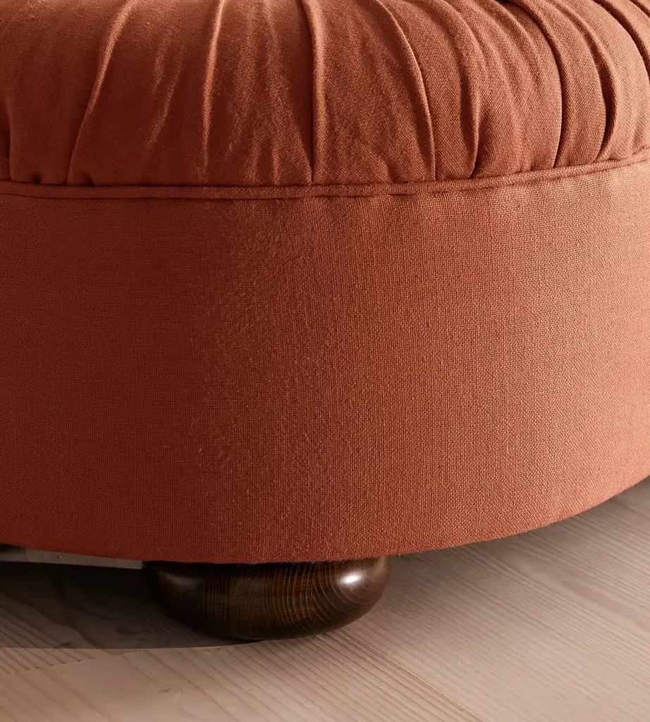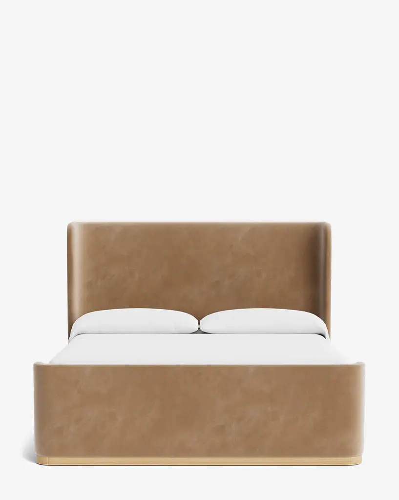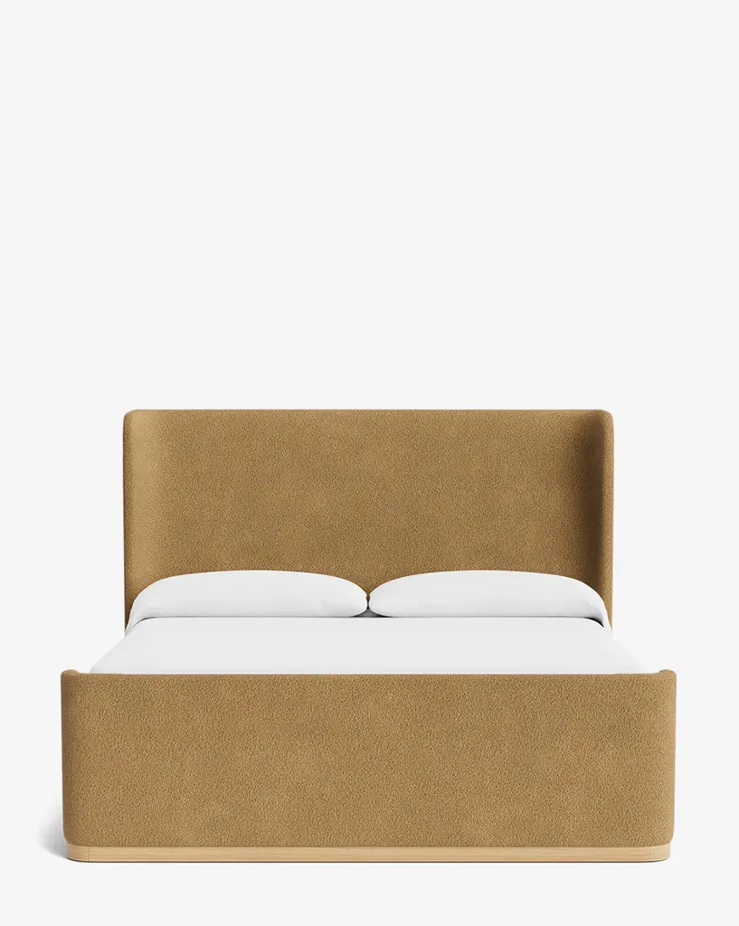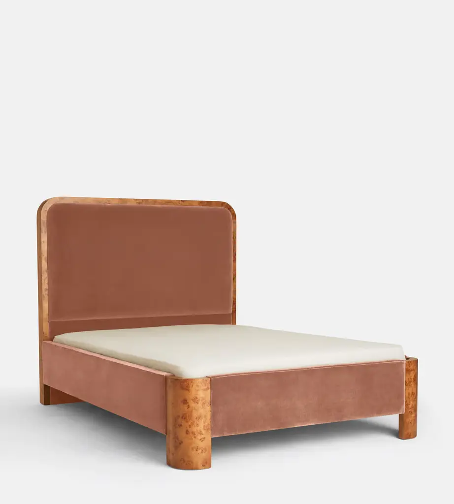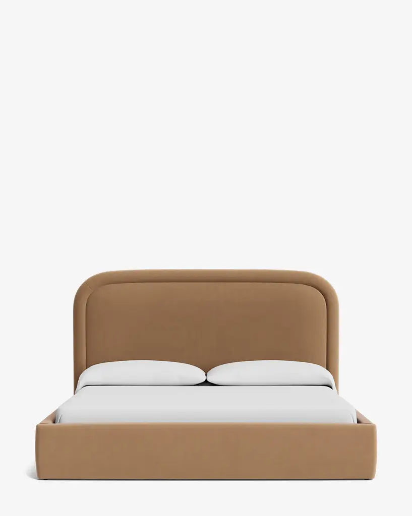 A relaxed profile that sits low to the floor showcases a mix of upholstery techniques, from a cushioned, sloped headboard to the ruched border that wraps around the frame. Finished with a low, cushioned headboard, the Vara bed's silhouette is made to mirror the aesthetic of Soho House Rome. It comes fully upholstered in velvet or linen that's ruched around the border.
