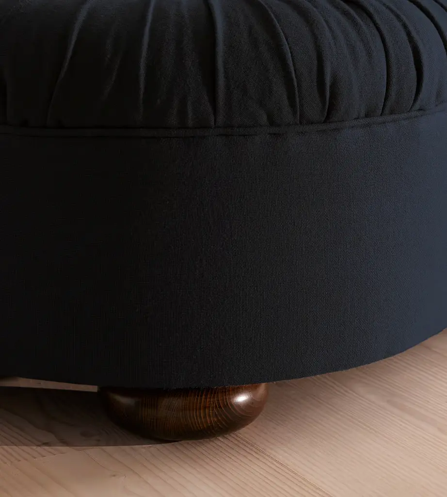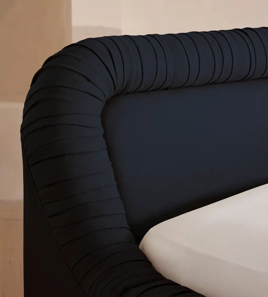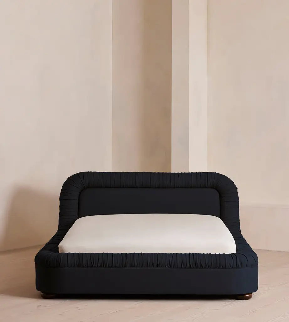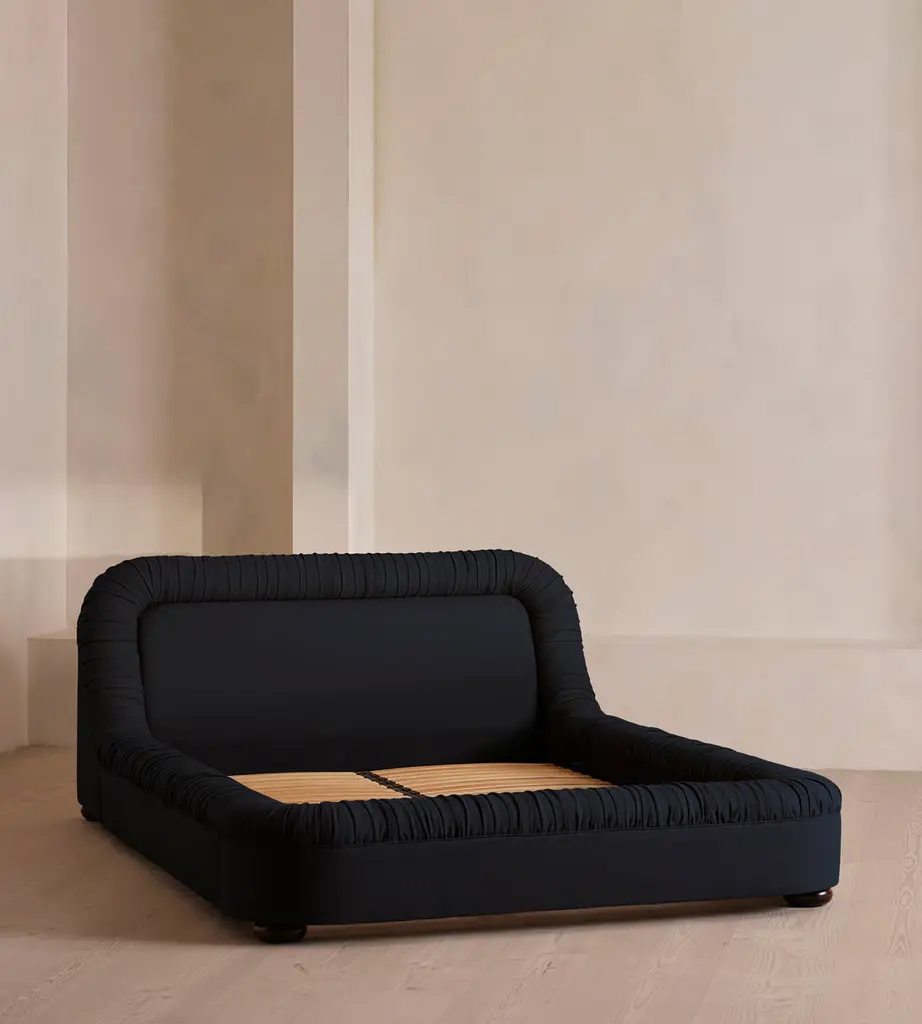A relaxed profile that sits low to the floor showcases a mix of upholstery techniques, from a cushioned, sloped headboard to the ruched border that wraps around the frame. Finished with a low, cushioned headboard, the Vara bed's silhouette is made to mirror the aesthetic of Soho House Rome. It comes fully upholstered in velvet or linen that's ruched around the border.