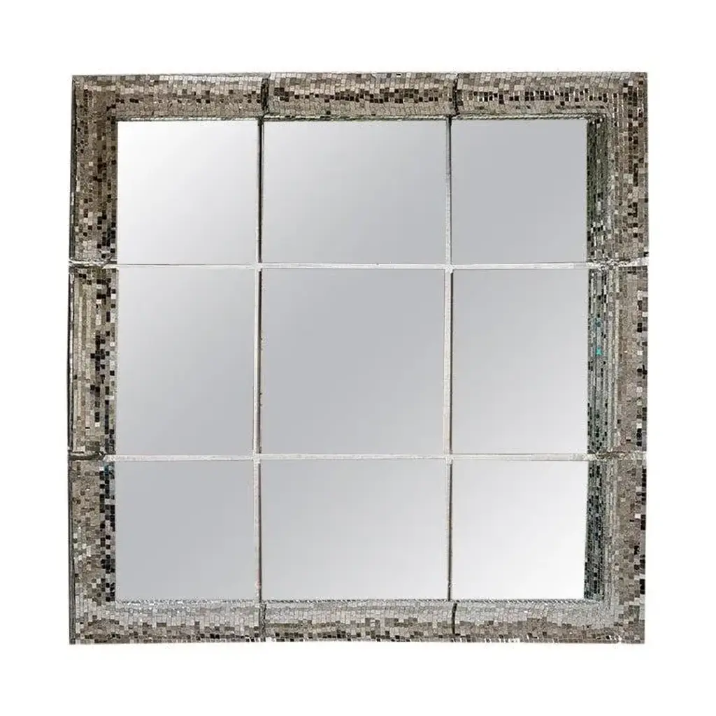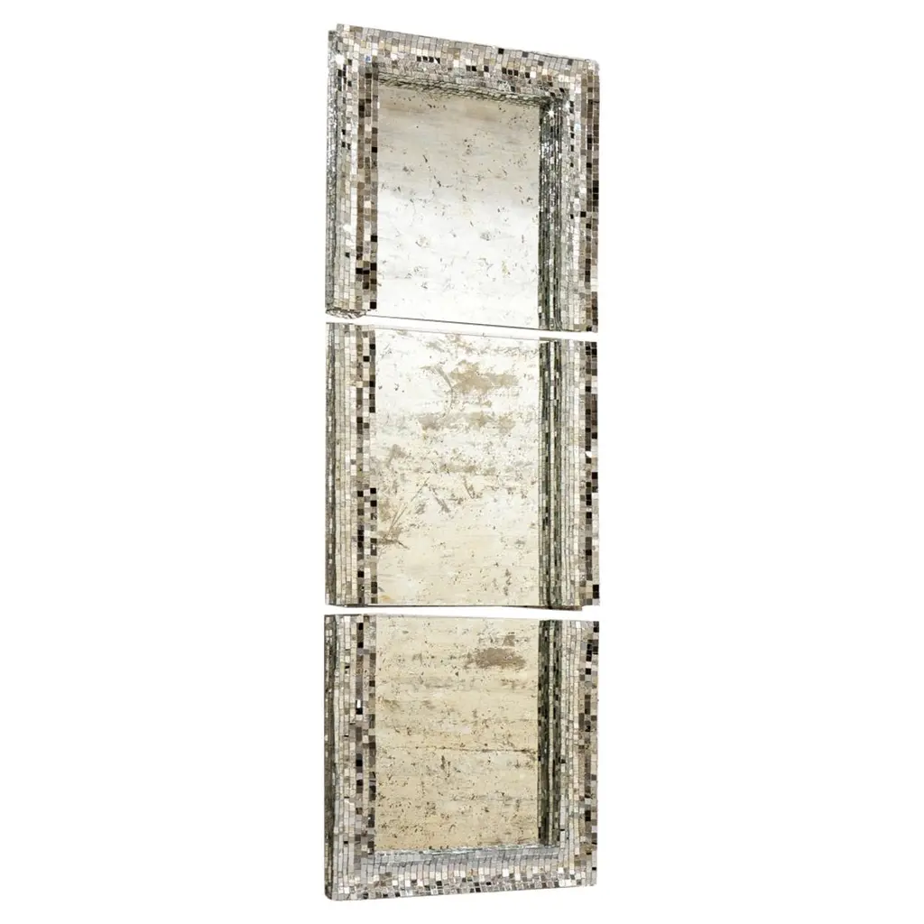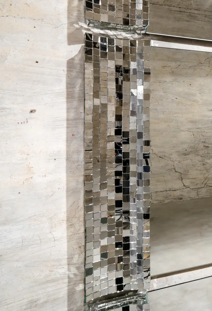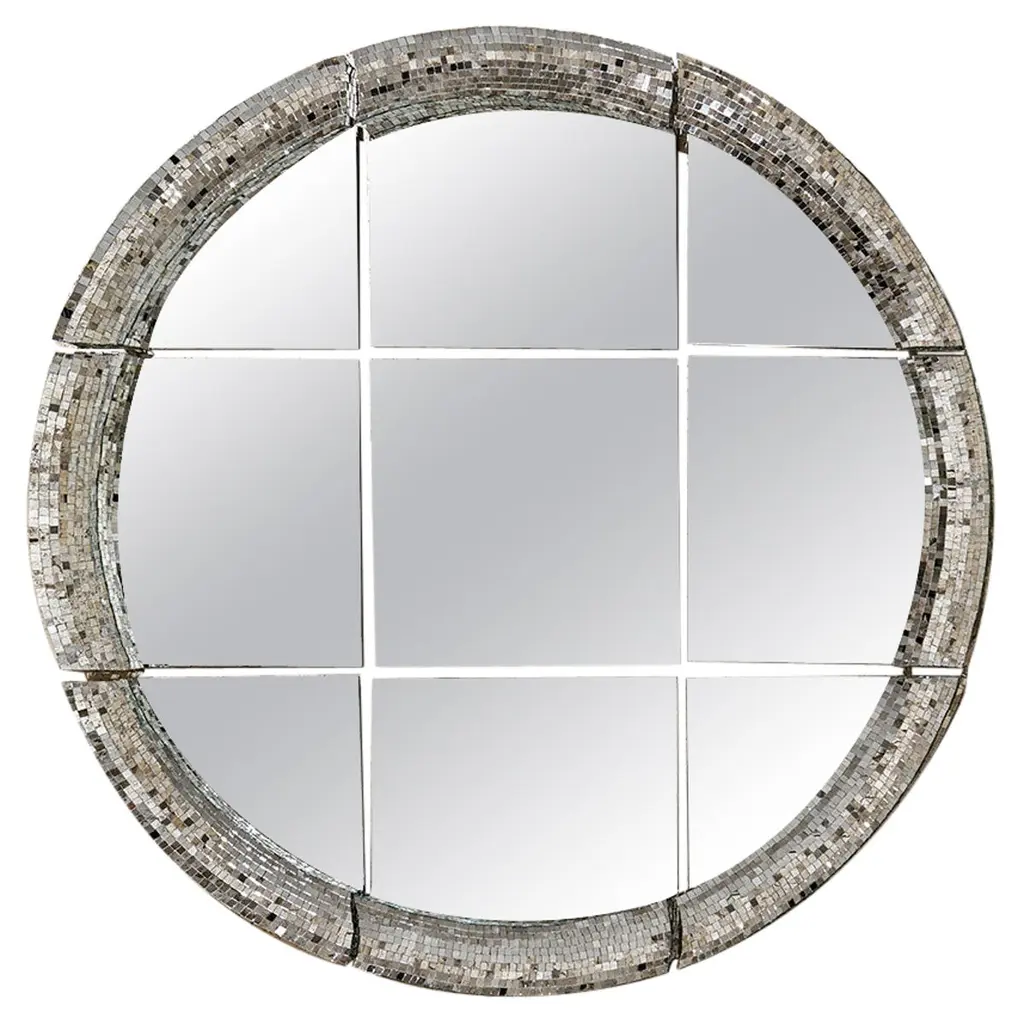 Very big mirror by Davide Medri Materials: mirror, glass mosaic (silver) Also available in gold and bronze. Dimensions: H 210 x D 210 cm Davide Medri was born in Cesena on August 7th 1967 and graduated at the Academy of Fine Arts in Ravenna, the Gino Severini State Mosaic Institute and the Albevainer Professional Mosaic School. After various artistic experiences, with the meeting with the Dilmos gallery in 1997, the first furnishing accessories in mirror mosaics were created. Today's portfolio includes, in addition to glass mosaic mirrors: tables, floor lamps, wall lamps and works of art. The manufacture is completely handmade inside the laboratory in Cesena. Every single piece of glass is cut and fixed by hand guaranteeing high quality, each artistic element is unique in its design and can be tailor-made in any size. Davide Medri's works of art have been successful in terms of market, press appreciation and recognition by architects and interior designers in Italy and abroad.