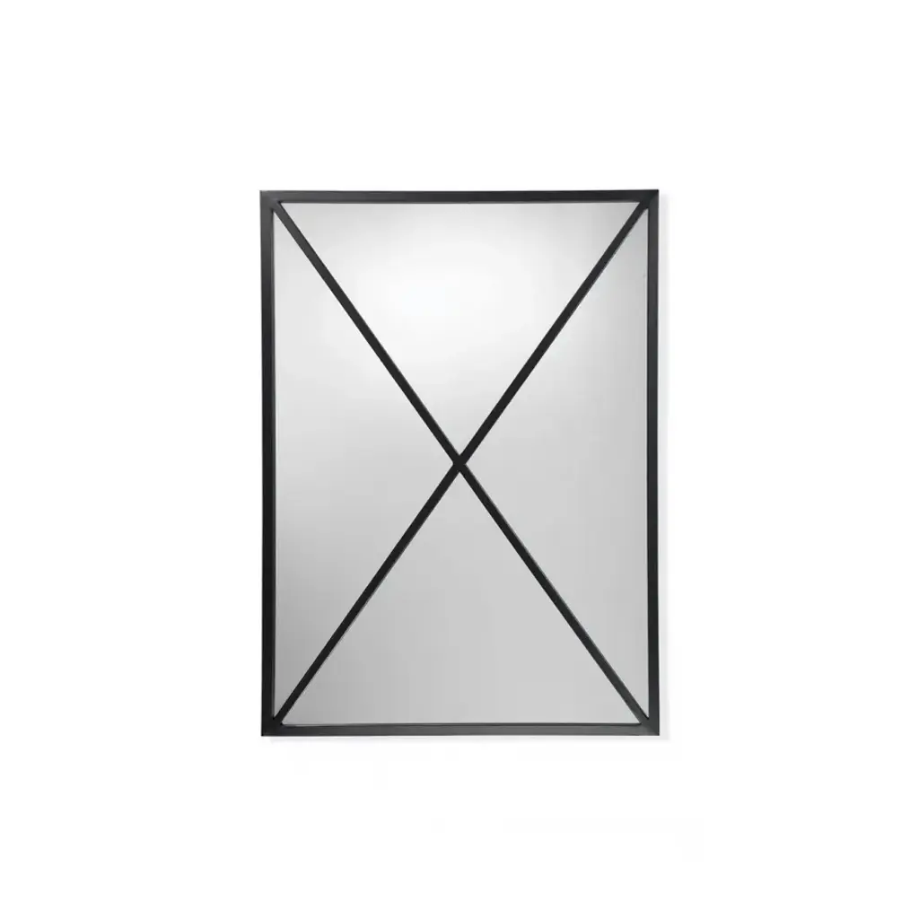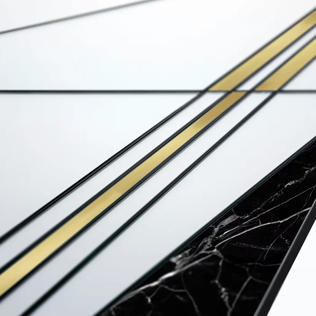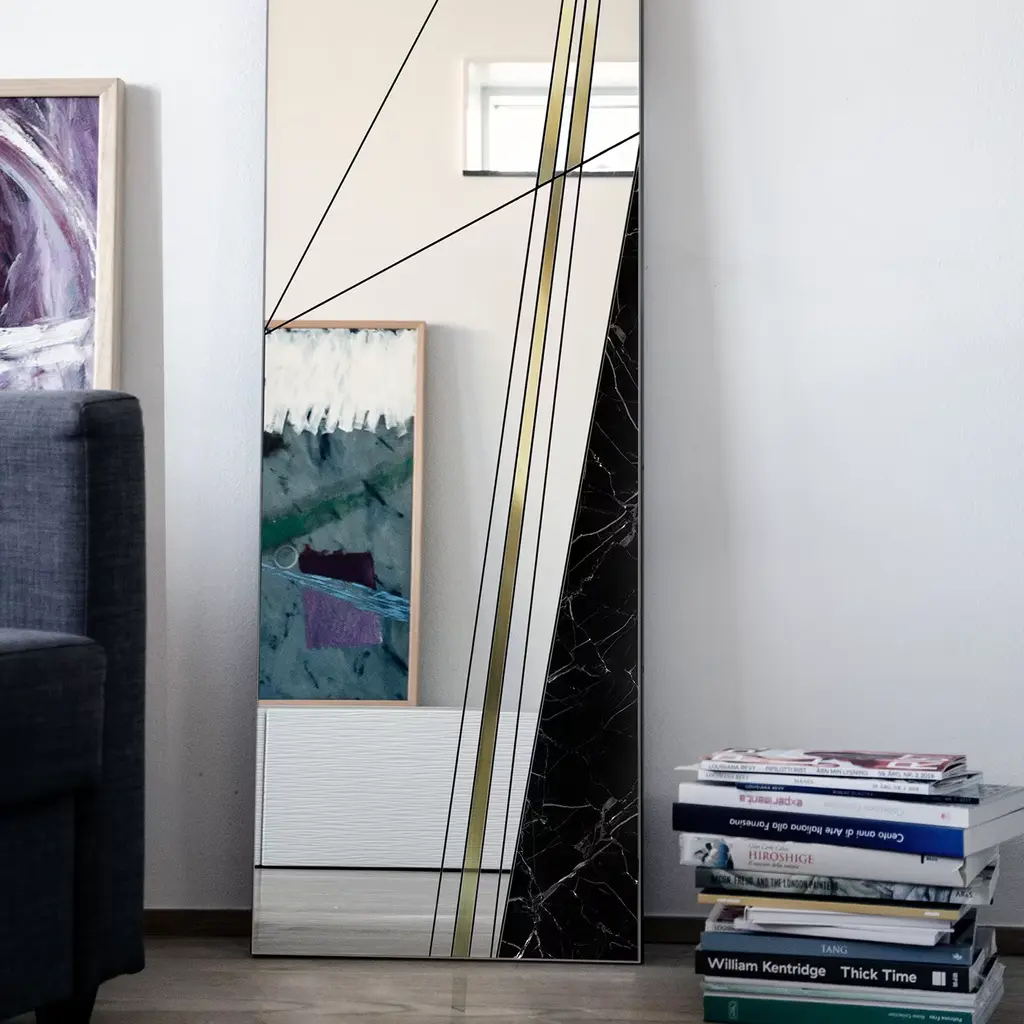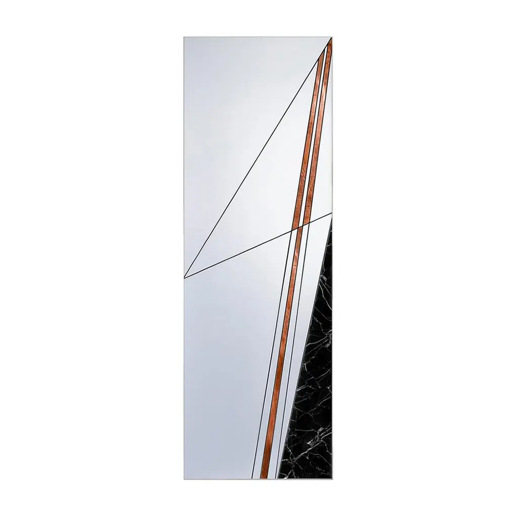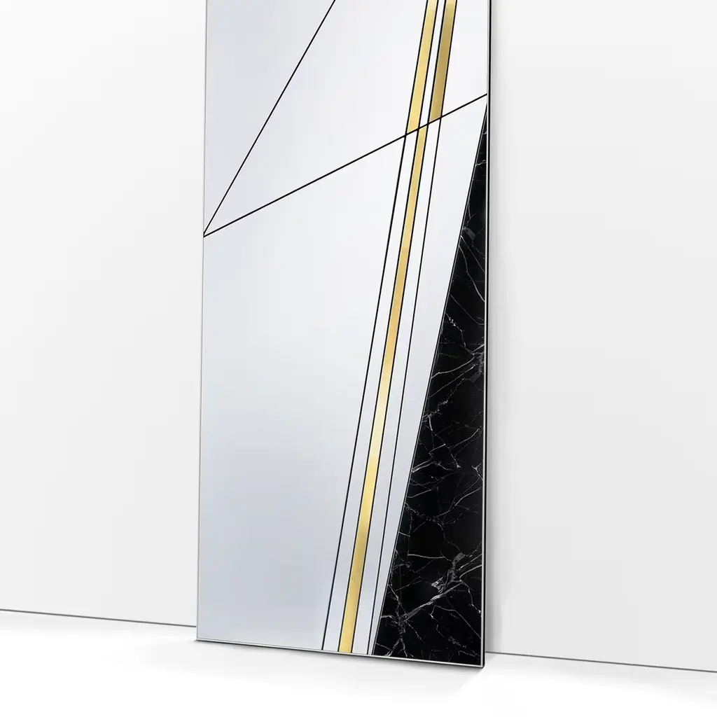 Part of a series of floor mirrors with a bold and sophisticated design, this piece will add an elegant decoration in a contemporary entryway, study, or living room. Its rectangular shape, supported by a wooden base, is made up of a series of mirrored glass elements joined in an aluminum trim and decorated with inserts in brushed brass and black Marquina marble. The chromatic effect is striking and highlights the various lines that run through the piece, evoking the network of public roads in Roman times.