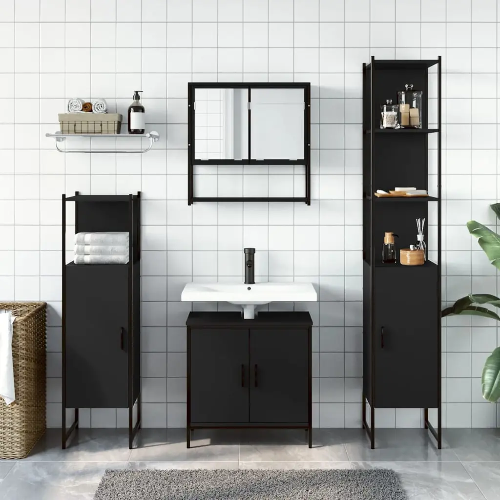 This 4-piece modern bathroom furniture set is both functional and stylish, making it a fab fit for your bathroom. Made from engineered wood with a sleek powder-coated steel frame, it includes a mirror cabinet, a sink cabinet, and both high and low cabinets to help keep your space organized and looking fresh. Ample Storage: This furniture set gives you loads of storage across five cabinets, so you can keep your toiletries, towels, and other bits neat and tidy. Modern Design: Its clean lines and sleek black finish mean it fits perfectly into any modern decor, and its practical design makes it versatile for various bathroom layouts. Wall-Mounted Configuration: The wall-mounted setup saves precious floor space and makes cleaning super easy, great for those smaller bathrooms. Durability: Built with quality engineered wood and a strong powder-coated steel frame to handle moisture and everyday use. Plus, it stays looking good for longer. Versatile Use: Perfect for family bathrooms, guest bathrooms, or powder rooms, this set covers all your storage needs for everyone from busy families to singles.