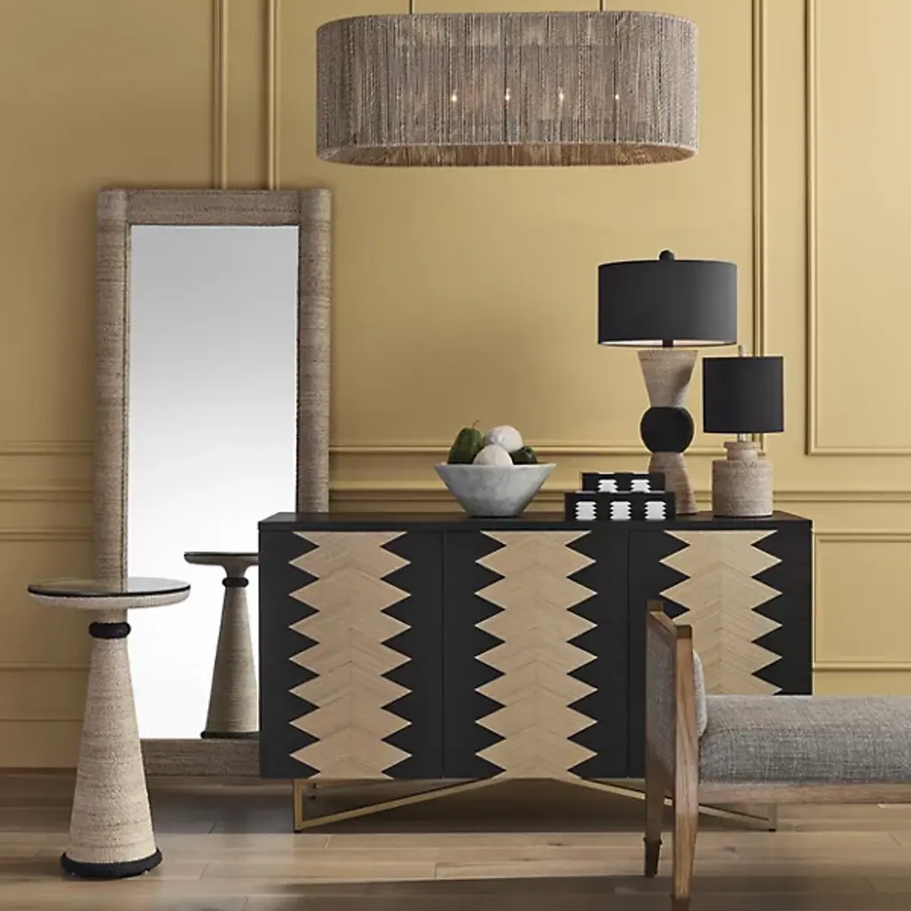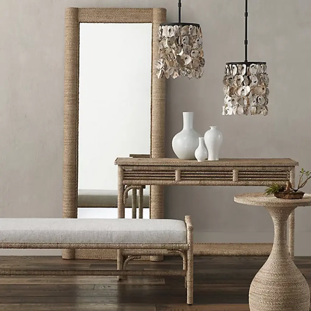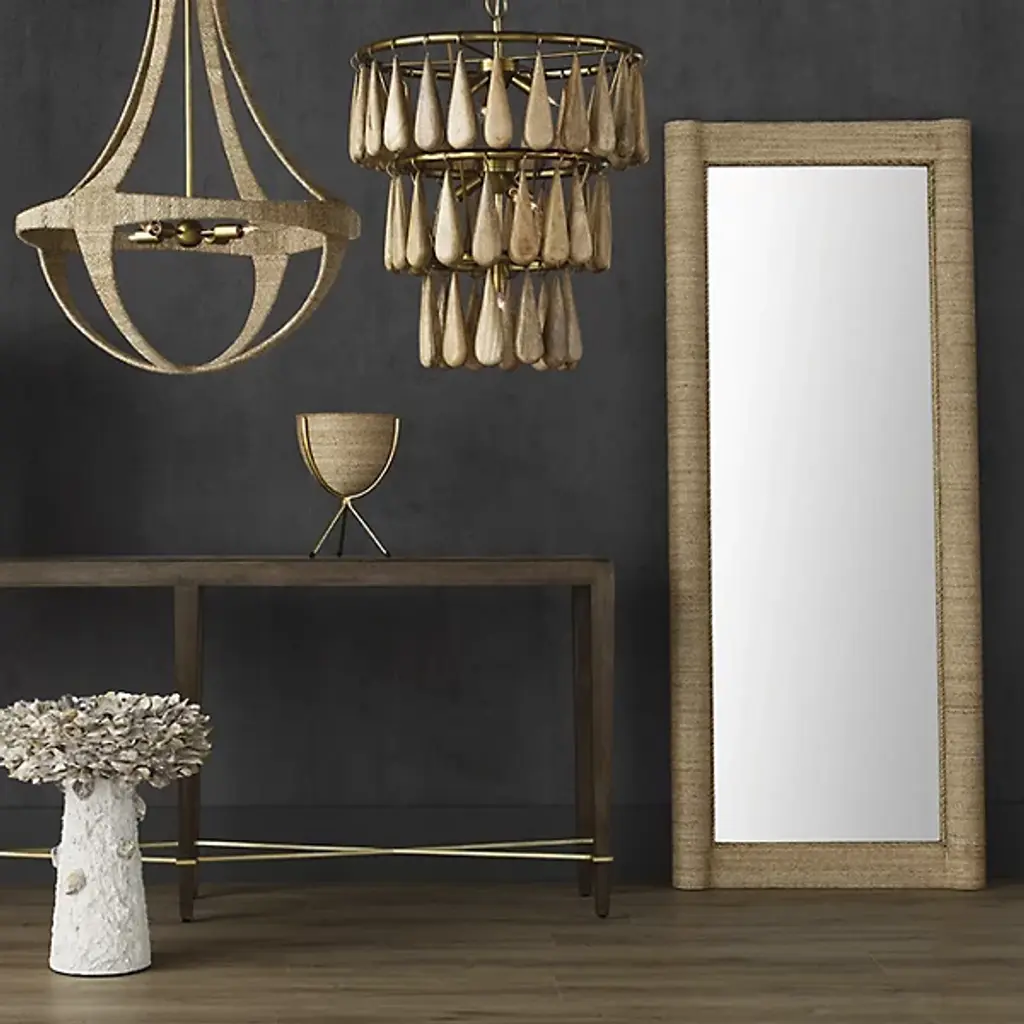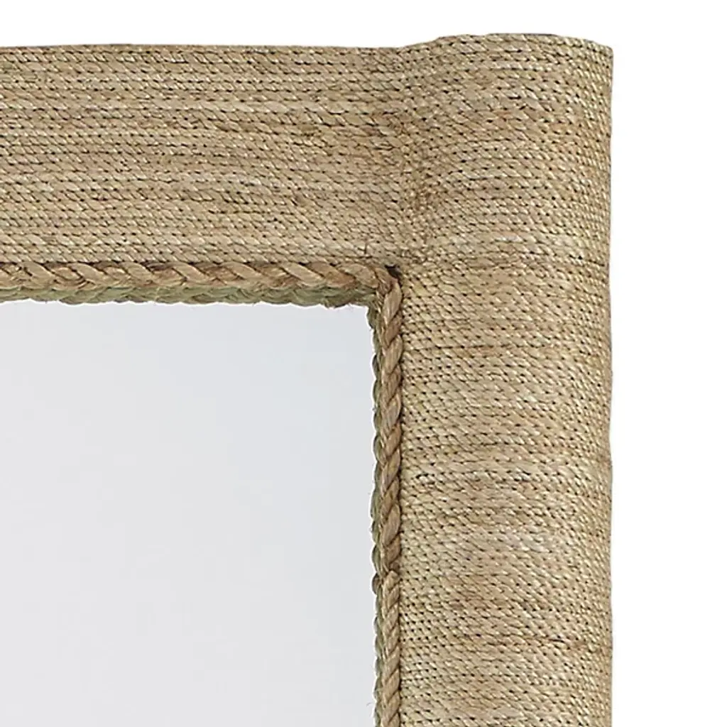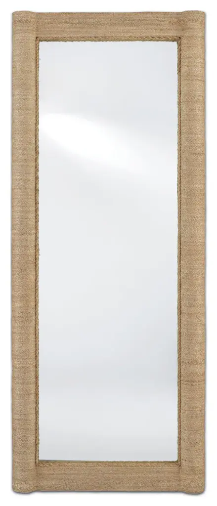 The Vilmar Floor Mirror from Currey & Company makes a bold coastal statement with its hand-applied Abaca rope frame. The natural texture and grand scale create a commanding presence flanked by curving columns on each side, blending organic warmth with refined craftsmanship. The mirror is designed and made with meticulous attention to detail, bringing a tropical, contemporary touch to any space while celebrating the beauty of natural materials.
