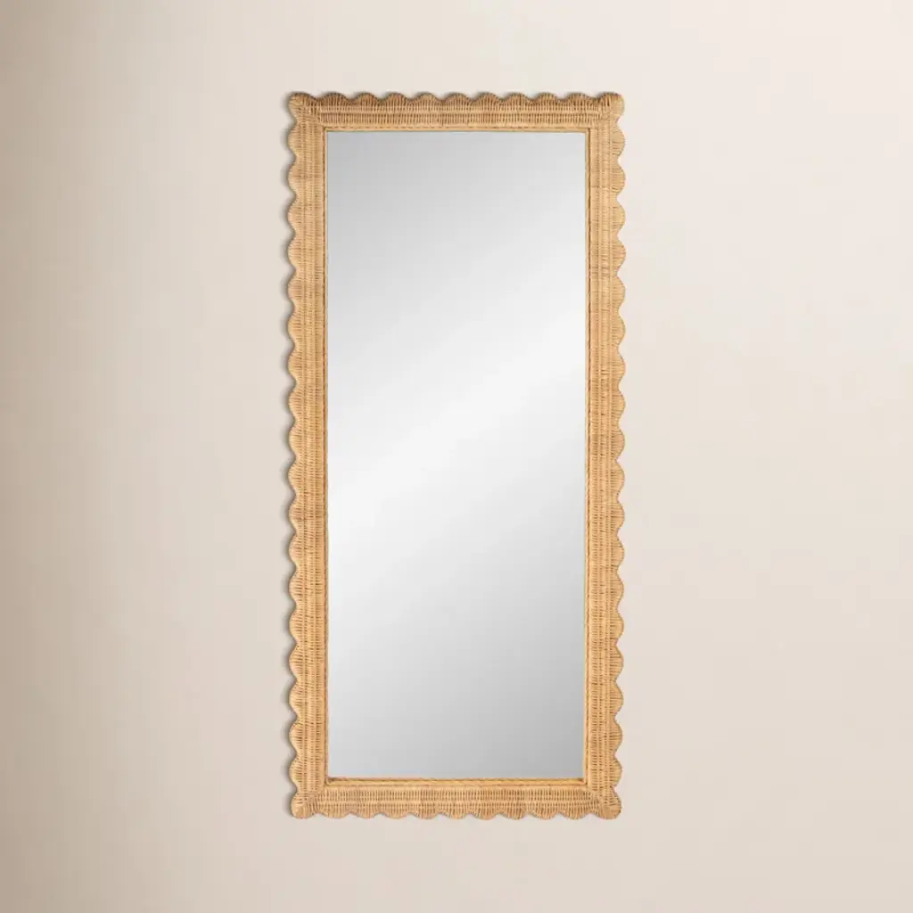 From Worlds Away, this beautiful floor mirror brings a bold statement to a living room or bedroom. Its sophisticated scalloped silhouette delights with simple, clean lines as its mirror reflects in your space. With rattan detailing, this mirror can be hung vertically and horizontally.