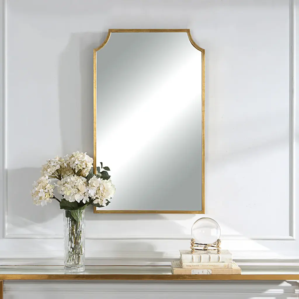 Defined by modern Asian design and elegant styling, the Worlds Away Finley pagoda style floor mirror is the essential finishing touch for your dressing room or grand foyer. Hand finished gold leaf frame evokes high style appeal.