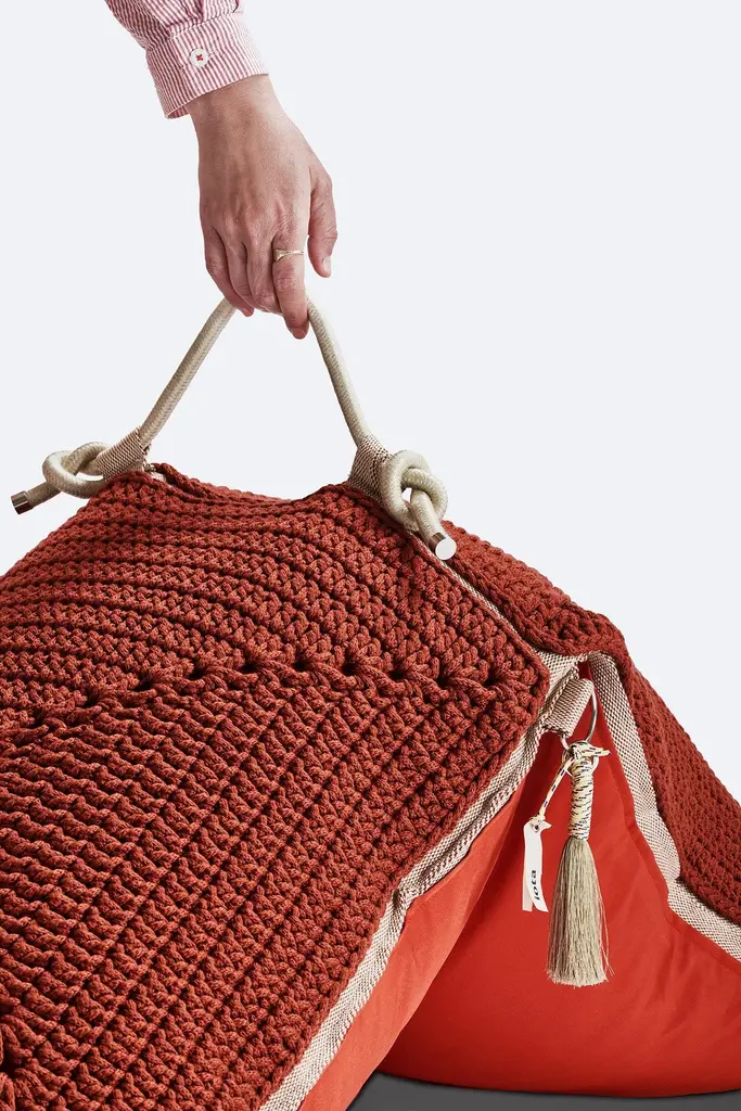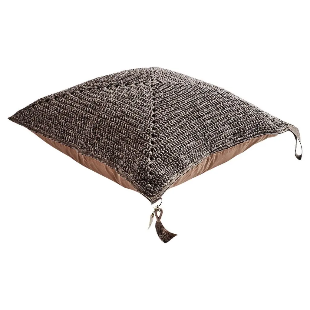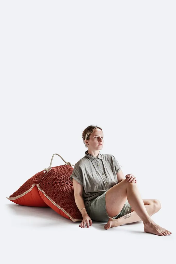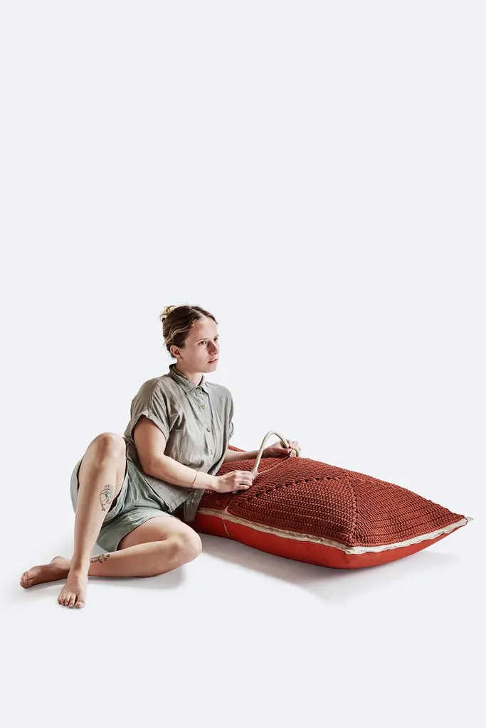 He Classic crochet granny square takes a contemporary twist in this large floor cushion. Two squares form the cushion which are than sewn together with bespoke outdoor webbing. It explores the aesthetics of nomads and wants to live both inside and out. Handmade from UV protected bespoke iota yarn in earth tones, the textile is soft, yet durable and suitable for interior and exterior spaces. This collection pairs thick and artful crochet with smart, high level tailoring.In addition to being a contemporary design studio IOTA soft living is a social project that employs, teaches and empowers women who are otherwise unable to work by teaching them the crochet technique and providing them work which they can carry out from their homes.Maintenance: Clean regularly with a vacuum cleaner, the use of chemical cleaning materials may harm the product. Try to address stains before they dry with a moist cloth. Products may vary up to 5% as objects are handmade.