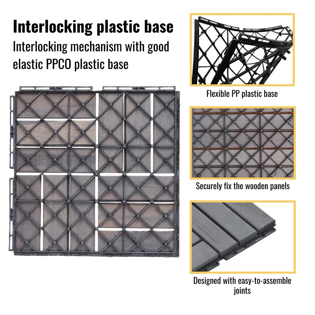 Perfect Size: Each tile has a square shape of 12 inches x 12 inches with 0.75 inches thickness. The wood part is 0.47 inches thick and the plastic part is 0.28 inches thick enough for drainage during the rainy season. Waterproof & Anti Mildew and Mold: Wood Deck Tiles were sanded with 240-grit sanding paper and then finished with water-based oil, which helps them Waterproof & Anti Mildew and Mold High Applicability: Suitable with many outdoor spaces such as garden, swimming pool, balcony, porch. DIY product: Simple to assemble using a rubber hammer Can be cut into small pieces: The wood & plastic parts are attached together by twisted plastic nail buttons, making the product can be cut to fit the corner positions.