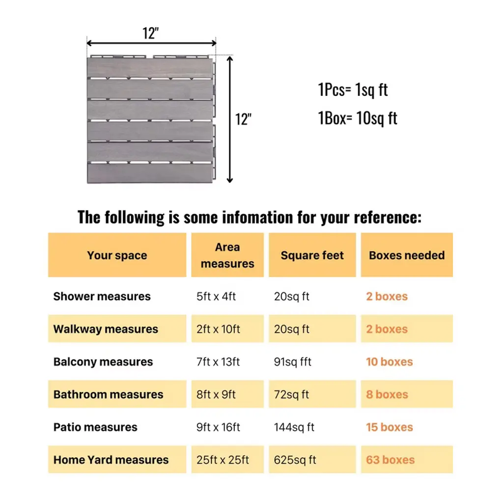 Depending on different lighting conditions,different environment and different recording device,the color of the product displayed is different. Product colors on our main photo were taken indoorswith standard lighting conditions -Before assembling these deck tiles,please make sure the underneathsurface is LEVEL and CLEAN of dirt and grime.Clean away rocks and weeds.These wood tiles are most easily installed over hard, flat surfaces like concrete or decking. Easytoassemblywithrubberhammer -Wood is a natural material thatwill age and requiresgradual cleanandmaintenance