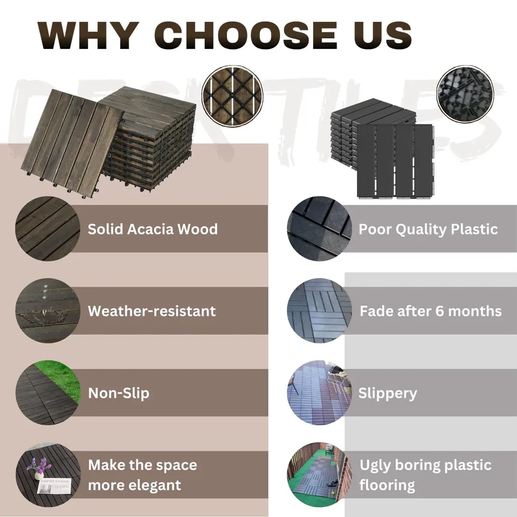 DescriptionTransform your outdoor spaces effortlessly with our Acacia Wood Interlocking Deck Tiles. Crafted from premium dark brown Acacia hardwood, these tiles are designed for durability and style. Perfect for patios, balconies, and pool sides, they offer a waterproof and anti-mildew solution that withstands the elements. With an easy DIY assembly, you can customize your layout to fit any space. Elevate your outdoor living experience today! Specification【Durable Construction】- Made from high-quality Acacia hardwood, these tiles are built to last and maintain their beauty in any weather condition. 【Waterproof & Anti-Mildew】- Sanded and finished with water-based oil, our tiles resist mold and mildew, ensuring a long-lasting, clean appearance. 【Easy DIY Assembly】- Designed for simple installation, these tiles can be easily laid out with a rubber hammer, making them perfect for any DIY enthusiast. 【Customizable Fit】- The interlocking design allows for easy customization; tiles can be cut to fit corners and unique spaces with precision. 【Versatile Usage】- Ideal for a variety of outdoor settings including gardens, balconies, and pool areas, providing a stylish and practical flooring solution.Product InformationPlace of Origin:Viet NamMain Color:Dark BrownMain Material:Acacia WoodProduct Style:American Design,American TraditionalUse Case:Garden & OutdoorProduct DimensionsAssembled Length (in.):12.00Assembled Width (in.):12.00Assembled Height (in.):0.75Product Weight (lbs.):1.43