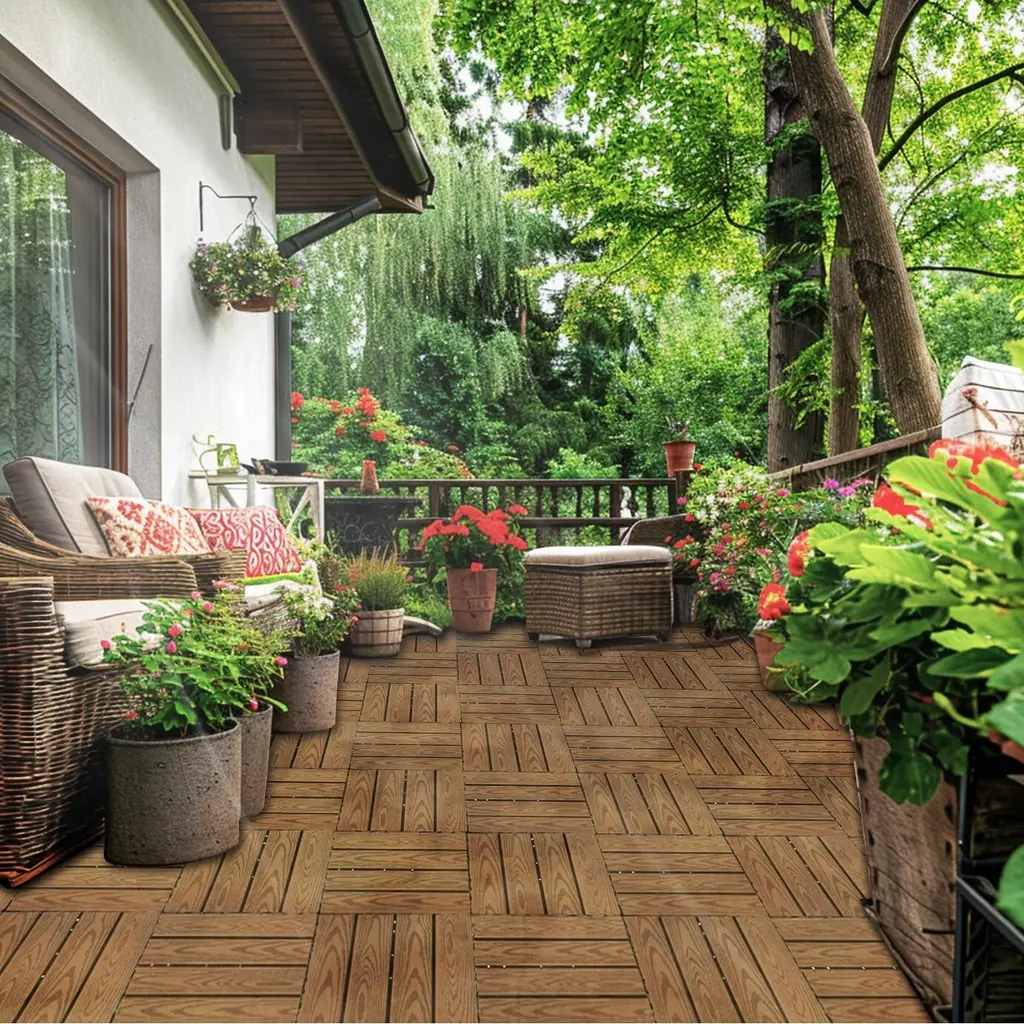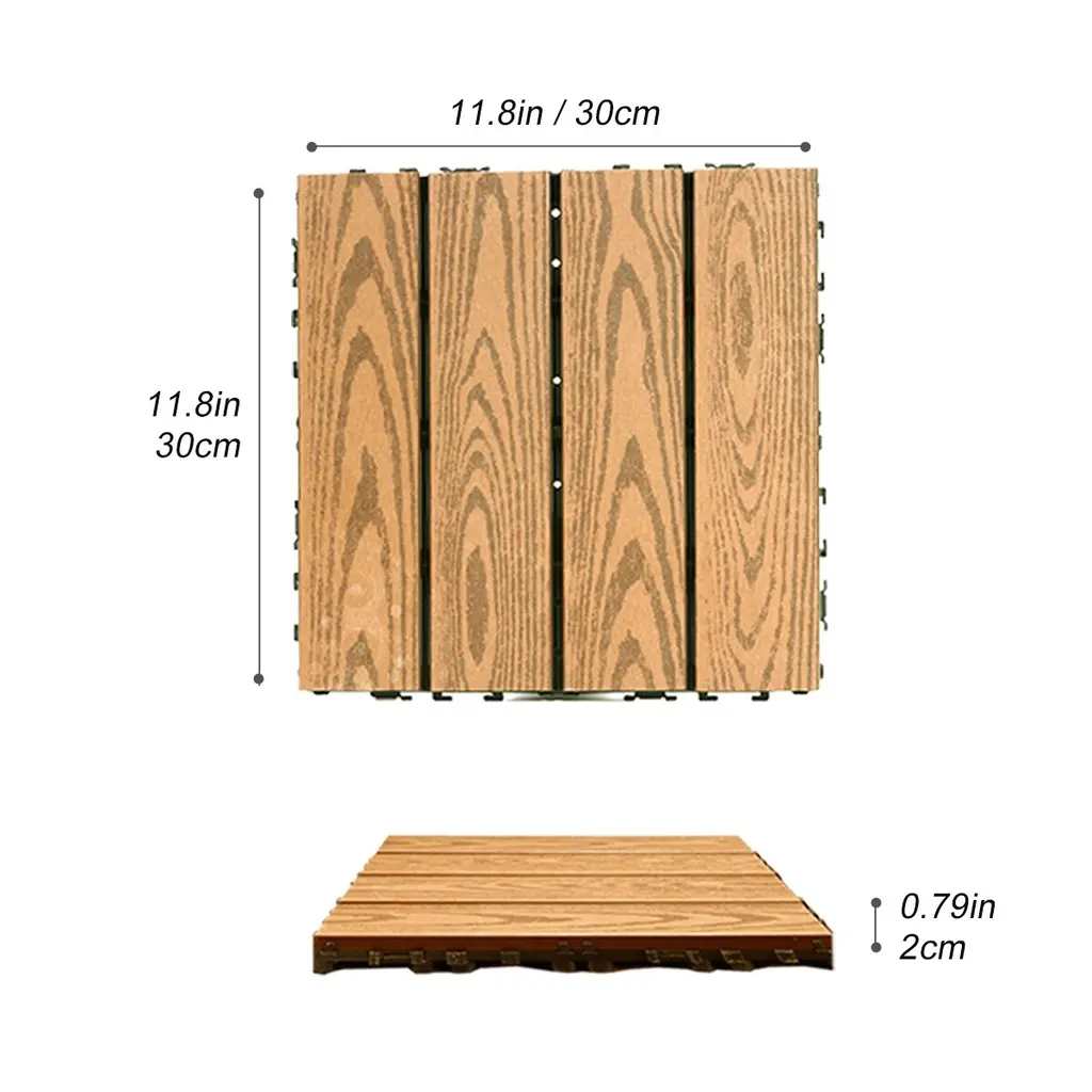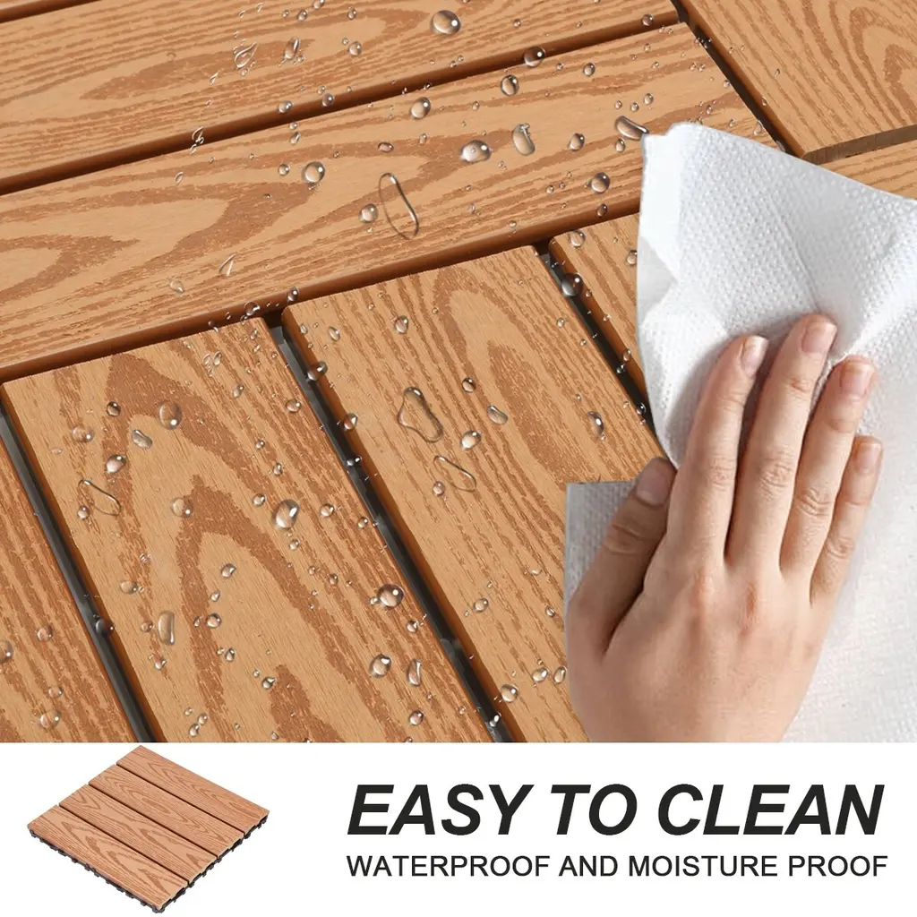 Revitalize your space effortlessly with our state-of-the-art interlocking patio tiles! Our wood flooring tiles are made of wood-plastic composites. Wood-plastic composite material makes superior water resistance compared to natural wood, resistant to swelling or decay, slip resistant. Due to its high adaptability, the wooden deck tiles are suitable for most outdoor spaces such as balconies, gardens, porches and roofs. The product is based on an interlocking mechanism that easily snaps into place, allowing for the easiest installation without any additional tools or equipment.
