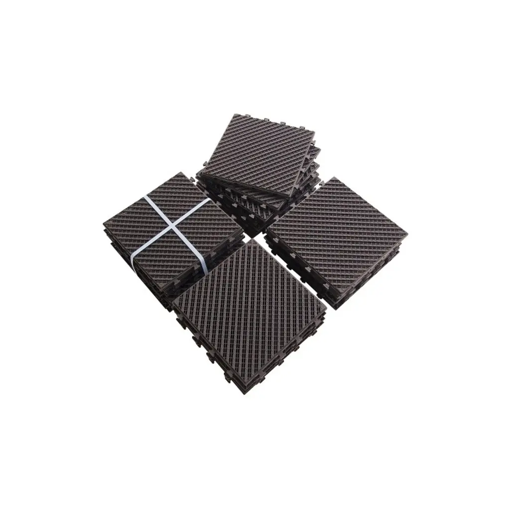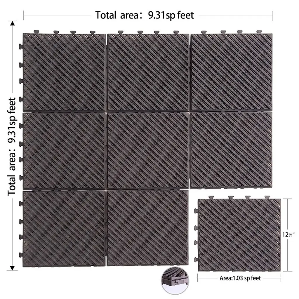WATER DRAINAGE DESIGN This patio deck tile features in four slats per tile. There are small gaps between each slat for better drainage and air flow. MULTIPLE COMBINATION Deck tiles aren't just a great way totransform an outdoor space. You cancheck out many other ways to utilizedeck tiles as well. UPGRADED INSTALLATION The interlocking plastic base makes it very easy to apply and no tools required. Align the groove on the other side, and then step on the seams until you hear an audible "click" to lock them in. DIVISIBLE FLOORING TILES This deck tiles could be cropped into various shape and size to fit it around a corner or a pole.