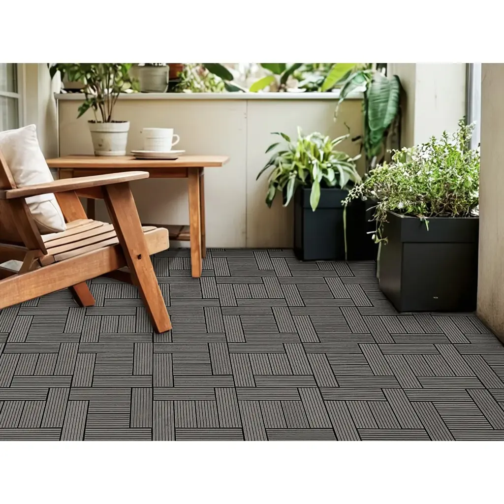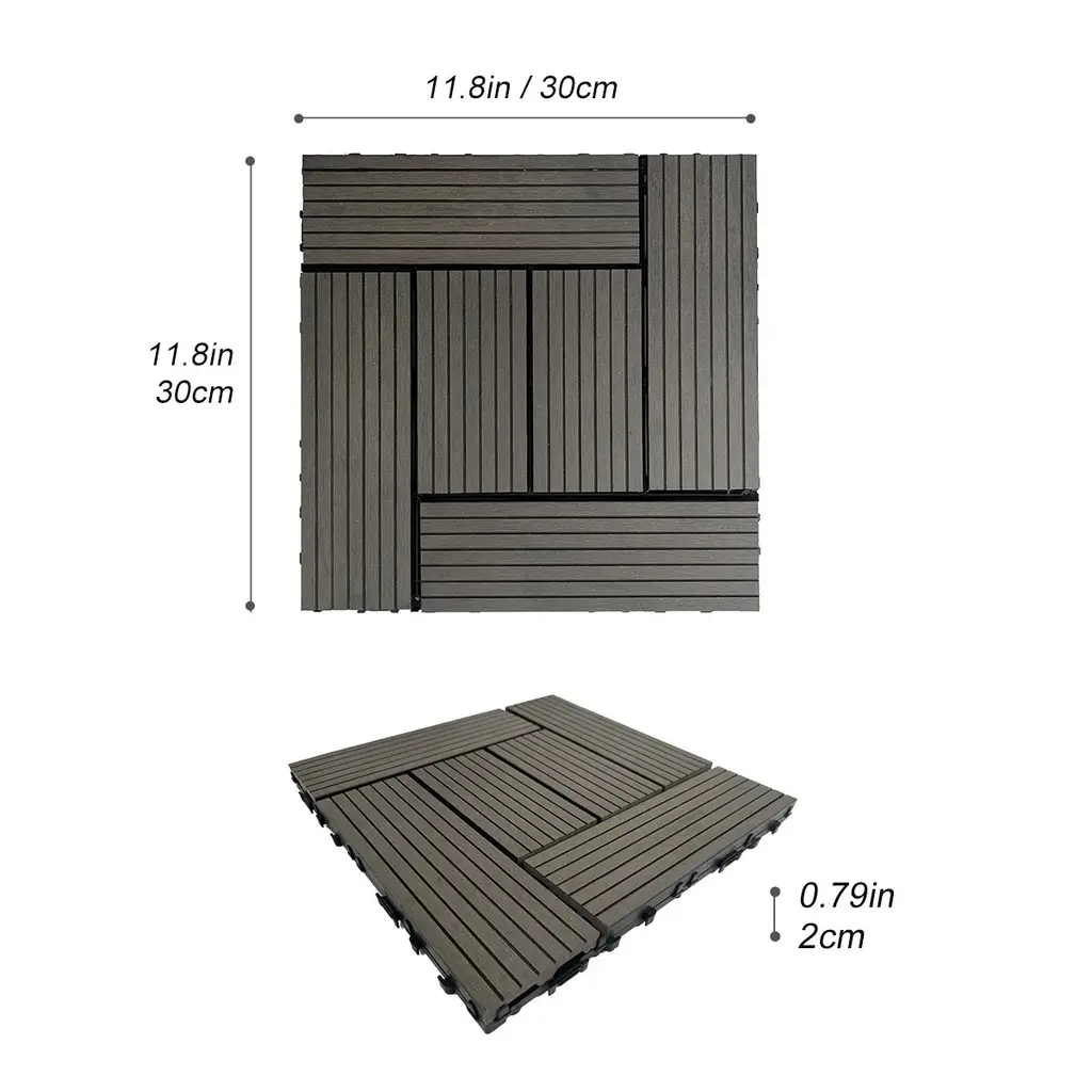 Easy to Install: These deck flooring tiles have an interlocking design base for easy do-it-yourself installation and no tools required for installation.No messy glue, no nails, perfect match and precision spacing between every tile. Unique Design:Our wooden tiles has a simple, beautiful design that can be used indoors and outdoors,6 slats per tile,there is a small gap between each slats for better drainage. Indoor & Outdoor Use: The interlocking deck tiles has PP platform base allows for adequate drainage and moisture, Great for decks, patios, balconies, around pools, saunas, showers, sun rooms, mud rooms, bedrooms, and more. High Quality:Our wood flooring tiles are made of wood-plastic composites. Wood-plastic composite material makes superior water resistance compared to natural wood, resistant to swelling or decay, slip resistant. Super durability and fade resistance.It is eco-friendly product for your home to create a beautiful space both inside and outside.
