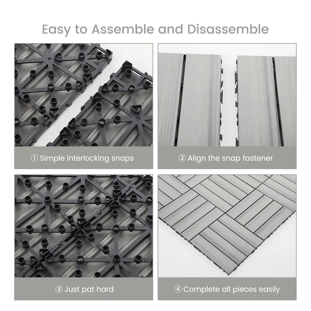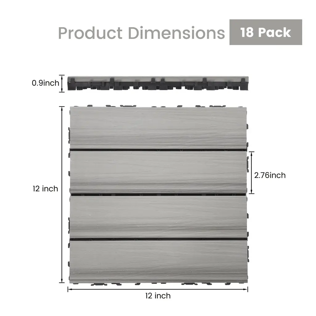 Upgraded Co-Extrusion Technology: You get 18 interlocking deck tiles, each measuring 12x12x0.9 inches. We use upgraded co-extrusion technology to protect the floor, make it waterproof and wear-resistant.Anti-slip And Open Design: Made of durable wood plastic material, the floor tiles are sturdy and have a grid design for drainage and ventilation, so you don't have to worry about drainage problems.Easy Assembly: These patio tiles are designed to interlock so you can install them quickly and easily yourself. You can DIY your decking or patio by cutting patio floor tiles as needed to create a unique modern space.Easy To Clean: These interlocking tiles are easy to clean with a wet/dry rag, mop or vacuum cleaner for indoor use and just rinse with water for outdoor use.Wide Application: Waterproof floor tiles can be used on porches, poolside, balconies, gardens, kitchens, saunas and bathrooms, etc., suitable for outdoor and indoor applications.Description:Name: Plastic FlooringColor: Co-extruded mahogany/Co-extruded teak/Co-extruded ancient woodSize: 12 x 12 FTShape: SquarePacking list:18 x Plastic Flooring Note: Different displays may cause the color of the item in the picture a little different from the real thing. Manual measuring,please allow 1~3mm error,thank you.