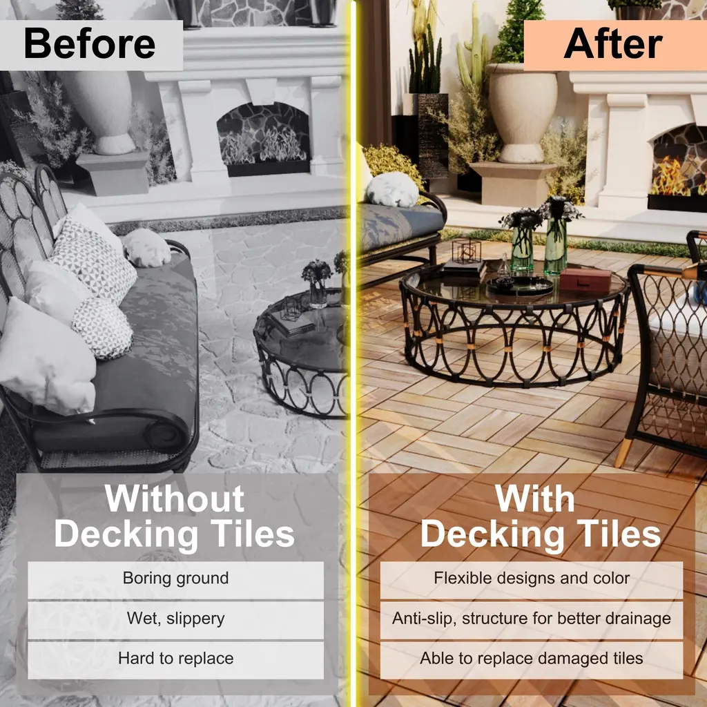 20 PCS Interlocking Deck Tiles Checker Pattern[Brand] brings to customers wood deck tiles made from solid wood and plastic base. Wood Deck Tiles were sanded with 240-grit sanding paper and then finished with water-based oil, which makes the product resistant to water. Thanks to its high adaptability, wood deck tiles are suitable for most outdoor spaces such as balconies, gardens, porches, and rooftops. The product is easily snapped in based on the interlocking mechanism for the simplest installation without any additional tools or equipment.Note- Depending on different lighting conditions, different environment and different recording device, the color of the product displayed is different. Product colors on our main photo were taken indoors with standard lighting conditions- Before assembling these deck tiles, please make sure the underneathsurface is LEVEL and CLEAN of dirt and grime. Clear away rocks and weeds. These wood tiles are most easily installed over hard, flat surfaces like concrete or decking.- Easy to assembly with rubber hammer- Wood is a natural material that will age and requires gradual clean and maintenancePoolsideAre you worried that your kids might fall while walking on the slippery floor? Use wood deck tiles around your swimming pool to ensure the safety of the whole familyBanconyDon't waste any space in your home. A romantic scene right at the balcony with wood deck tilesGardenWooden floors make your garden cleaner and more beautifulIndoor spaceAre you too bored with the usual tiled floor? Wooden flooring tiles will make your space special