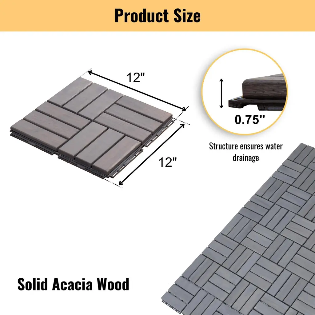 Perfect Size: Each tile has a square shape of 12 inches x 12 inches with 0.75 inches thickness. The wood part is 0.47 inches thick and the plastic part is 0.28 inches thick enough for drainage during the rainy season. Waterproof & Anti Mildew and Mold: Wood Deck Tiles were sanded with 240-grit sanding paper and then finished with water-based oil, which helps them Waterproof & Anti Mildew and Mold High Applicability: Suitable with many outdoor spaces such as garden, swimming pool, balcony, porch. DIY product: Simple to assemble using a rubber hammer Can be cut into small pieces: The wood & plastic parts are attached together by twisted plastic nail buttons, making the product can be cut to fit the corner positions.