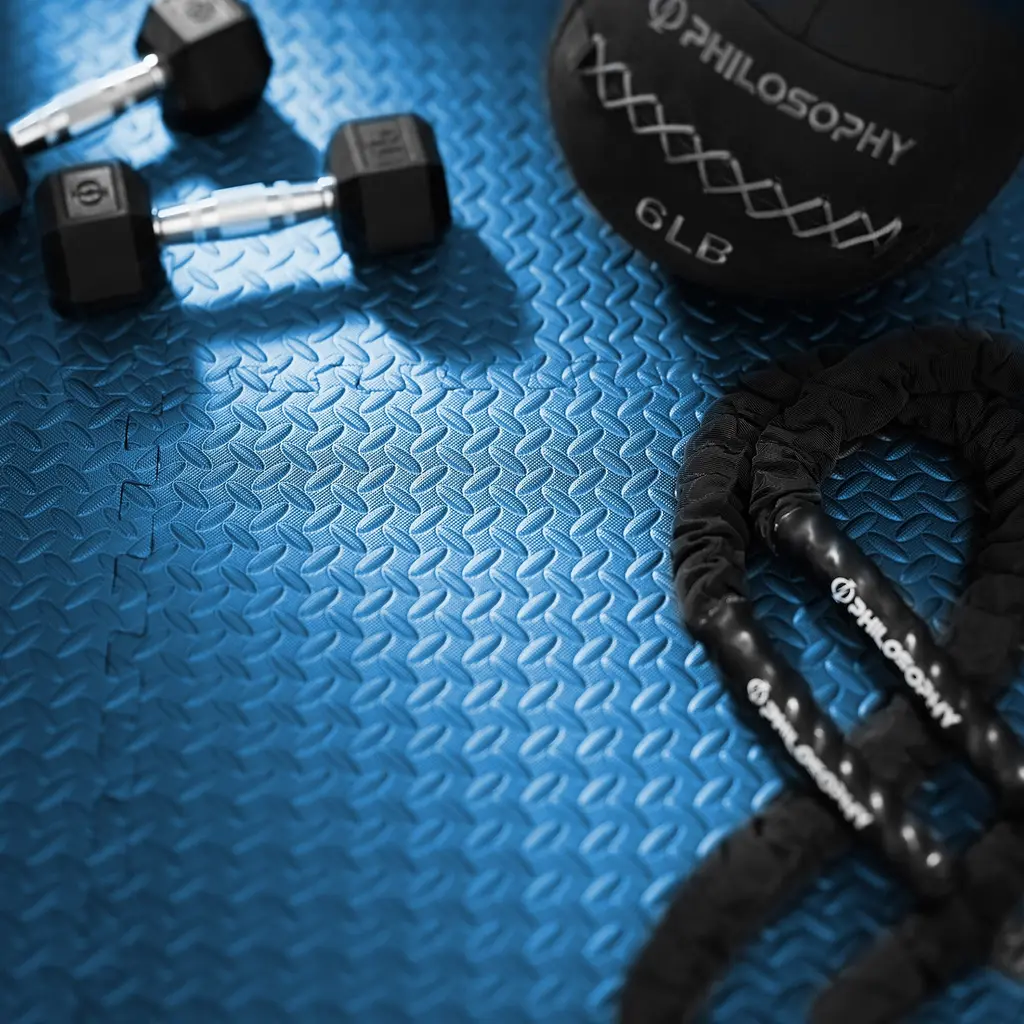 Cover 12 – 120 SQ. FT: This versatile interlocking mat with a thickness of 1/2" supports any type of workout conveniently. Each tile either measures 12"x 12" or 24"x 24". Our options provide 12, 24, 36, or 120 SQFT of coverage to create an expansive space for getting physical.Durable construction: The EVA foam tiles have a non-skid texture to elevate your workout. They provide support and comfort to complement all types of exercise. Whether for a home gym, fitness facility, or even as a children’s playmat, puzzle mats create a comfortable surface for exercise and physical activity.Easy assembly: These interlocking foam tiles are excellent to cover just about any space because they can be cut to fit as needed. The overall mat can be assembled and disassembled in minutes, however, if you need to customize it to fit into your space, expect it to be just as simple.Protective Flooring: With our non-skid, shock-absorbing tiles in place, it is easy to protect your flooring while providing a comfortable space to practice your favorite workouts. They also provide noise-reduction great for those intense workout sessions.Waterproof construction: Interlocking gym floor mats need to handle heavy-duty activity, and ours was created to withstand action at the highest level. It features a waterproof design which is ideal for gyms, even swimming pool edges as it can handle wet situations with ease. Furthermore, it is easy to clean. Create the ultimate home gym workout space with these interlocking floor mats. The most versatile flooring solution out there for active spaces, our puzzle mats are easy to assemble and an absolute breeze to customize to your specific floor plan because they can be cut to fit. If you’re searching for a comfortable, shock-absorbing, easy to set-up exercise mat, this is just what you need. For activities such as MMA, gymnastics, cross training, HIIT, aerobics, pilates, and yoga, among many others, these foam tiles offer endless versatility.Created of 1/2" thick EVA foam, each interlocking puzzle piece is a square tile that can be customized to fit your space. This material is beyond versatile! It is waterproof, which makes it perfect for workout rooms, home gyms, and even as a children’s playroom flooring. It is easy to clean and works great in places prone to moisture. If you’re looking for affordable, convenient, and comfortable options for flooring for your home workout area, look nother than our interlocking floor mat!Our Interlocking Floor Mats are available in either 12"x 12" or 24"x 24" tiles providing 12, 24, 36, or 120 SQFT of coverage. Philosophy Gym provides quality fitness equipment with exceptional durability to meet all your workout needs.