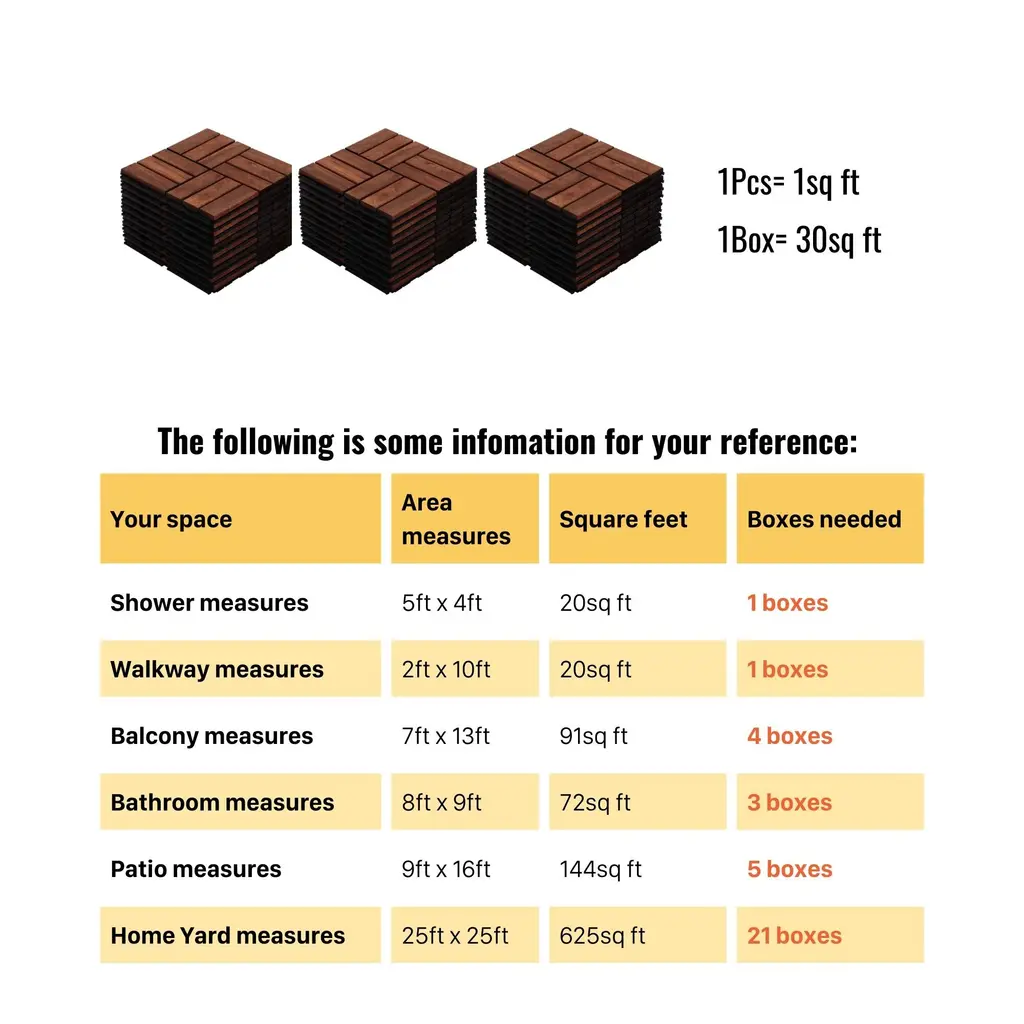 30 Pcs Checker Pattern Interlocking Deck Tiles 12" X 12" Square Acacia Hardwood Outdoor Flooring For Patio Balcony Poolside - Brown