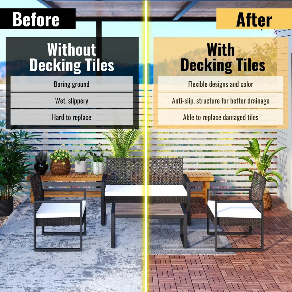 🍻Perfect Size: Each tile has a square shape of 12 inches x 12 inches with 0.75 inches thickness. The wood part is 0.47 inches thick and the plastic part is 0.28 inches thick enough for drainage during the rainy season. 🎉Waterproof & Anti Mildew and Mold: Wood Deck Tiles were sanded with 240-grit sanding paper and then finished with water-based oil, which helps them Waterproof & Anti Mildew and Mold✨ 🍁High Applicability: Suitable with many outdoor spaces such as garden, swimming pool, balcony, porch. 🌈DIY product: Easy to assemble with rubber hammer🔥 🧀Can be cut into small pieces: The wood & plastic parts are attached together by twisted plastic nail buttons, making the product can be cut to fit the corner positions.🌞