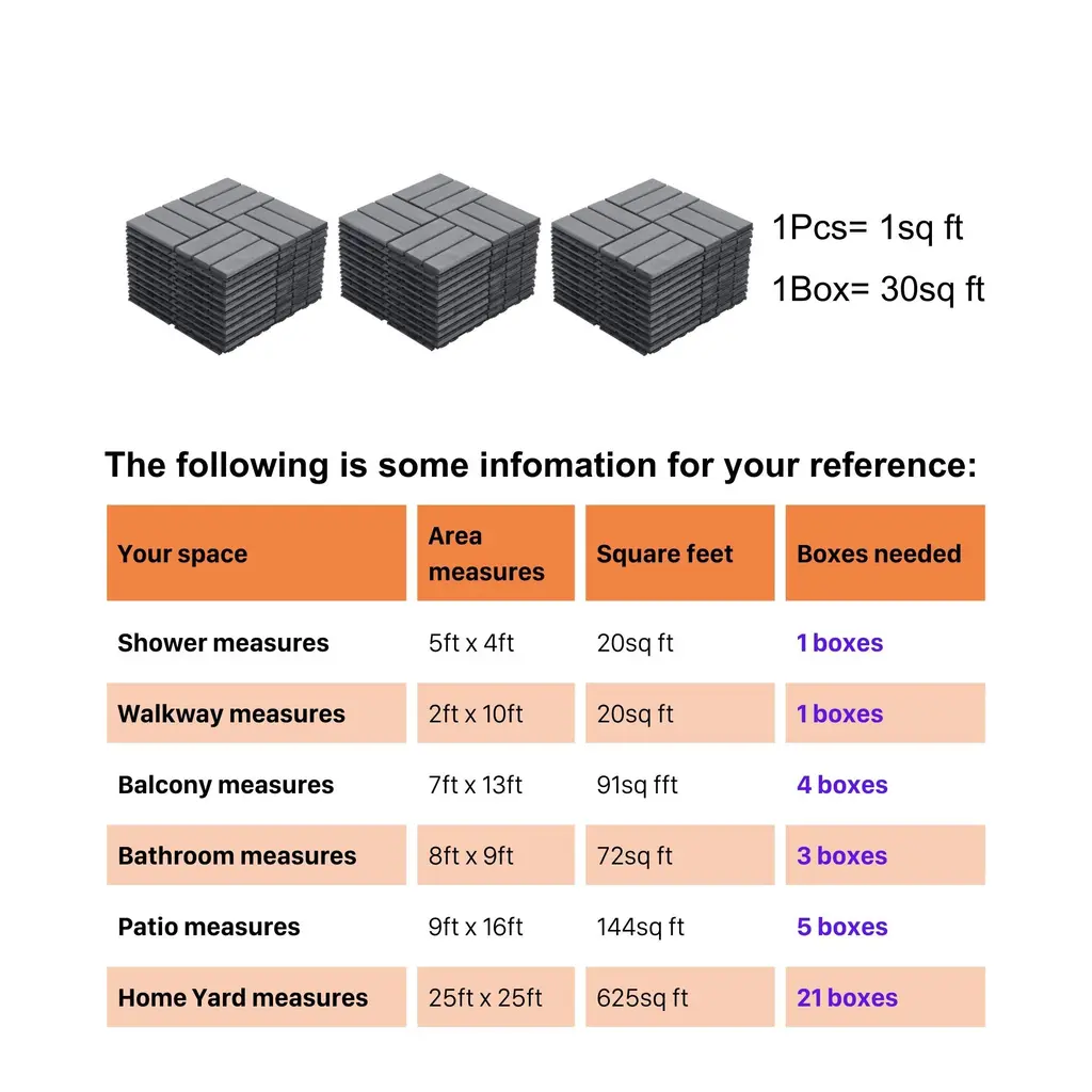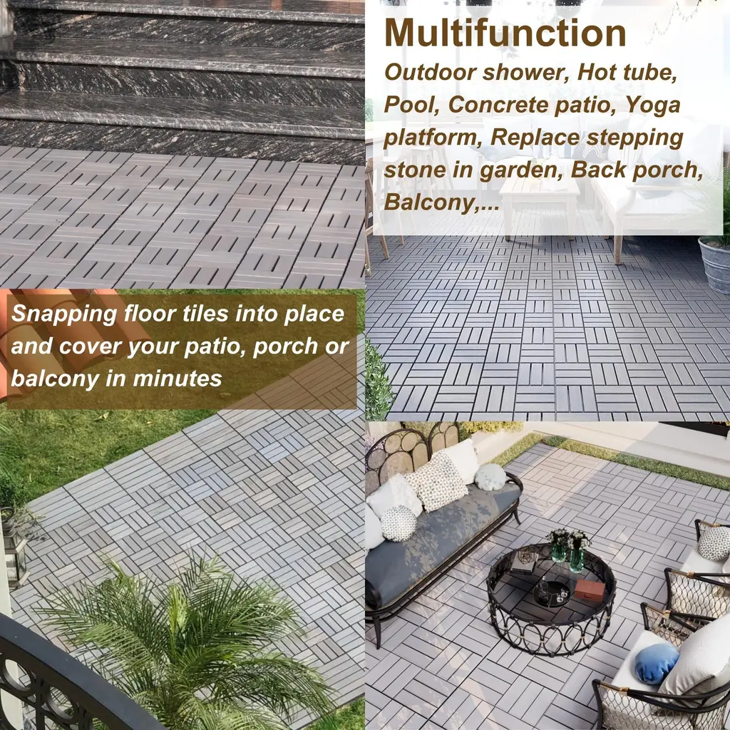 30 PCS Interlocking Deck Tiles Checker Pattern[Brand] brings to customers wood deck tiles made from solid wood and plastic base. Wood Deck Tiles were sanded with 240-grit sanding paper and then finished with water-based oil, which makes the product resistant to water. Thanks to its high adaptability, wood deck tiles are suitable for most outdoor spaces such as balconies, gardens, porches, and rooftops. The product is easily snapped in based on the interlocking mechanism for the simplest installation without any additional tools or equipment.Note- Depending on different lighting conditions, different environment and different recording device, the color of the product displayed is different. Product colors on our main photo were taken indoors with standard lighting conditions- Before assembling these deck tiles, please make sure the underneathsurface is LEVEL and CLEAN of dirt and grime. Clear away rocks and weeds. These wood tiles are most easily installed over hard, flat surfaces like concrete or decking.- Easy to assembly with rubber hammer- Wood is a natural material that will age and requires gradual clean and maintenancePoolsideAre you worried that your kids might fall while walking on the slippery floor? Use wood deck tiles around your swimming pool to ensure the safety of the whole familyBanconyDon't waste any space in your home. A romantic scene right at the balcony with wood deck tilesGardenWooden floors make your garden cleaner and more beautifulIndoor spaceAre you too bored with the usual tiled floor? Wooden flooring tiles will make your space special
