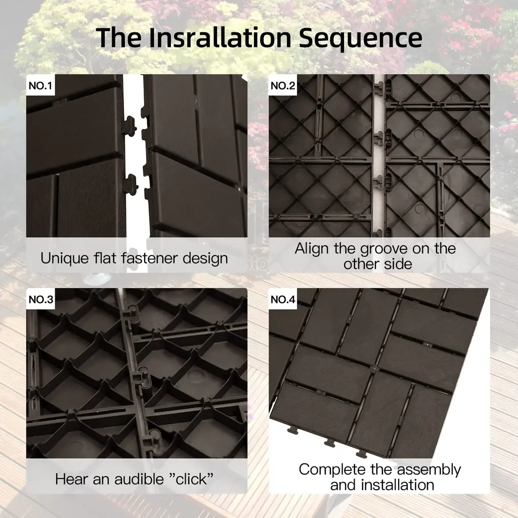 Transform any space into a stylish oasis with Domi Outdoor Living Patio Decking Tiles. Designed for effortless upgrades, these interlocking tiles are perfect for patios, balconies, bathrooms, and more. Made from premium plastic, they offer reliable durability, weather resistance, and a clean, modern look.Available Options: • Colors: Dark Brown, Grey • Sizes: 9-Piece, 36-Piece, 44-Piece SetsFeatures • Versatile Use – Great for patios, balconies, bathrooms, and other indoor or outdoor spaces. • Tool-Free Installation – Interlocking design makes setup fast and easy with no nails, glue, or tools required. • Low Maintenance – Simply sweep or rinse with a hose; easily disassemble for deep cleaning. • Safe & Smart Design – Non-slip surface with open grid pattern improves drainage and airflow, helping prevent puddles. • Premium Quality – Made from durable plastic that resists warping, cracking, rotting, staining, and scratching under normal use.Have questions? Our customer service team is here to help. Whether you need installation tips, product recommendations, or order assistance, feel free to reach out—we’ll get back to you as soon as possible.