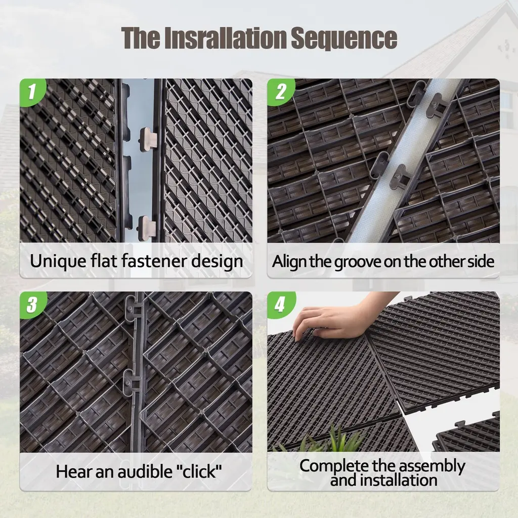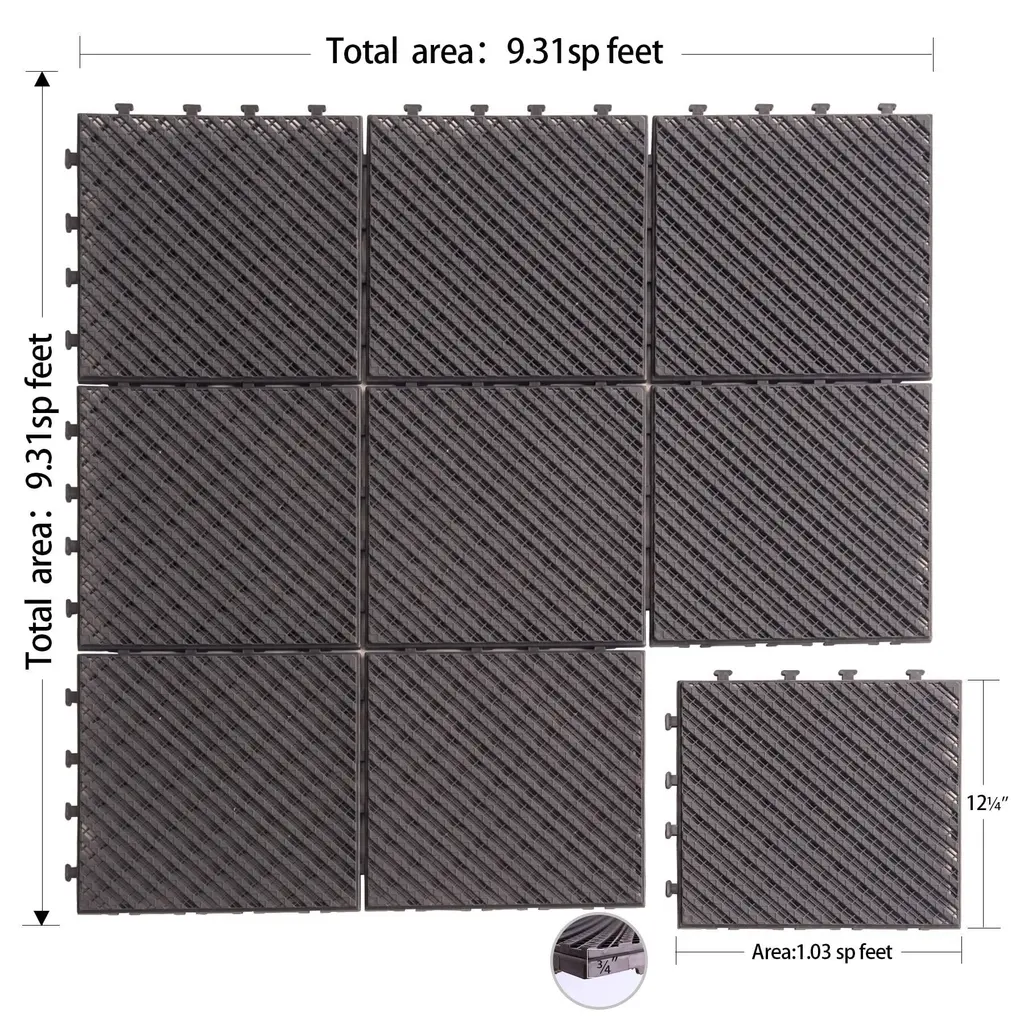 Elevate your outdoor space with Domi Interlocking Deck Tiles Designed for both durability and creativity, these weather-resistant tiles are ideal for any DIY enthusiast. Whether you're upgrading a patio, balcony, or poolside, enjoy a stylish, sustainable flooring solution that’s easy to install and built to last.Available Options • Colors: Dark Gray, Dark Brown • Sizes: 9-Piece, 27-Piece, 36-Piece, 44-Piece SetsFeatures • Long-Lasting Durability – Made from high-quality composite plastic, these tiles resist insects, stains, fading, mold, cracking, and decay—perfect for year-round outdoor use. • DIY-Friendly Design – The 4-sided interlocking base makes it easy to click tiles together and rearrange them into personalized patterns. • Indoor & Outdoor Versatility – Built to handle all weather conditions, these tiles work great for patios, decks, balconies, kitchens, bathrooms, and more. • Quick & Easy Installation – No tools or glue required—perfect for DIY projects and hassle-free upgrades. • Eco-Conscious Materials – Made with recyclable plastic, these tiles reflect Domi’s commitment to sustainable outdoor living. • 1-Year Warranty – Backed by quality assurance for peace of mind.Need help? Our customer service team is ready to assist! Whether you have questions about installation, product options, or your order, feel free to reach out—we’ll respond as soon as possible to ensure a smooth experience.