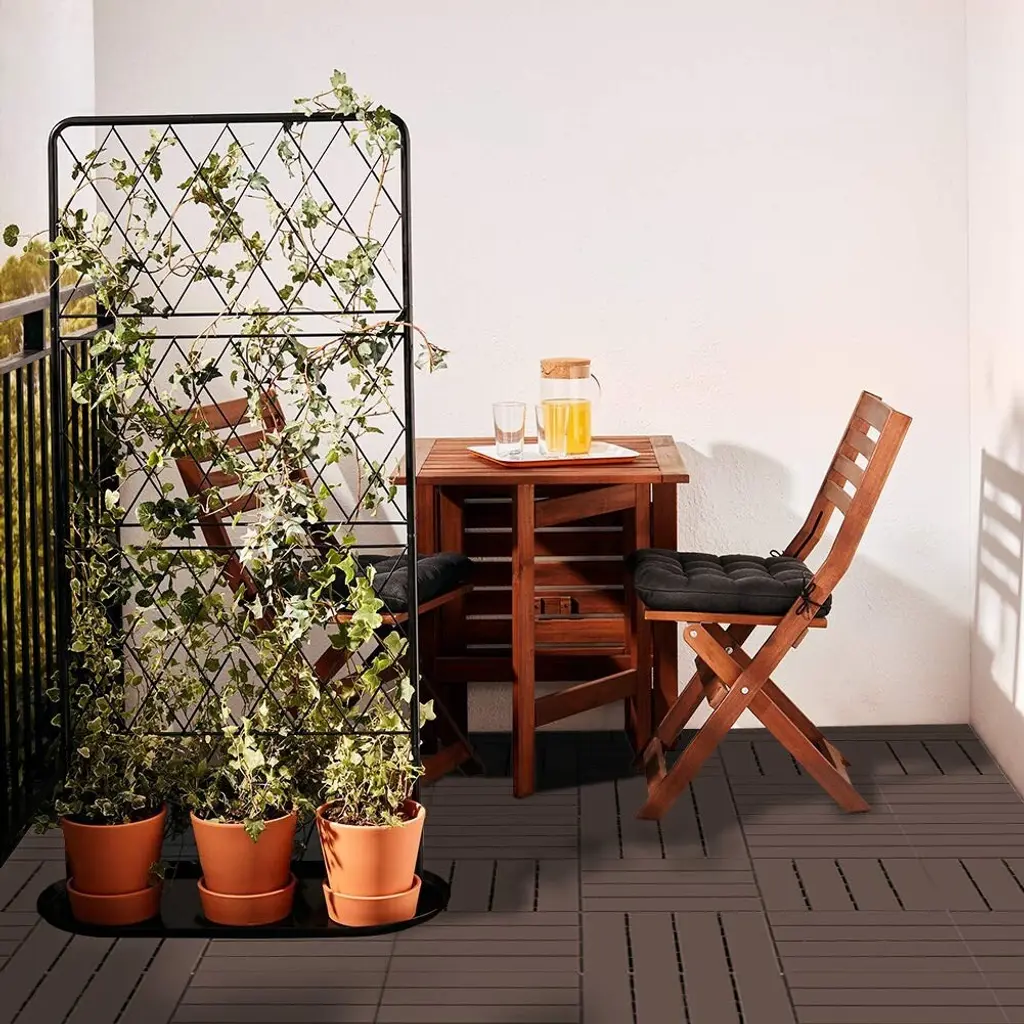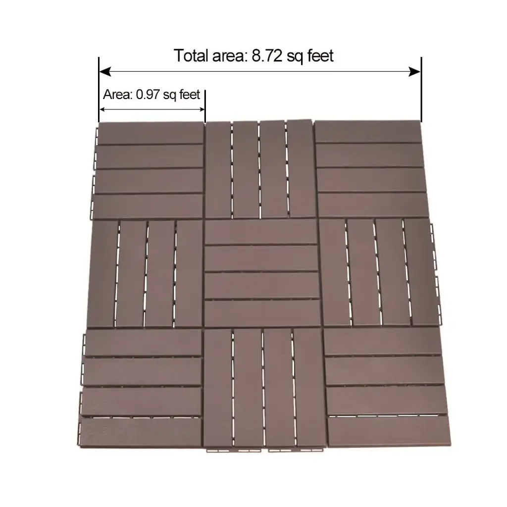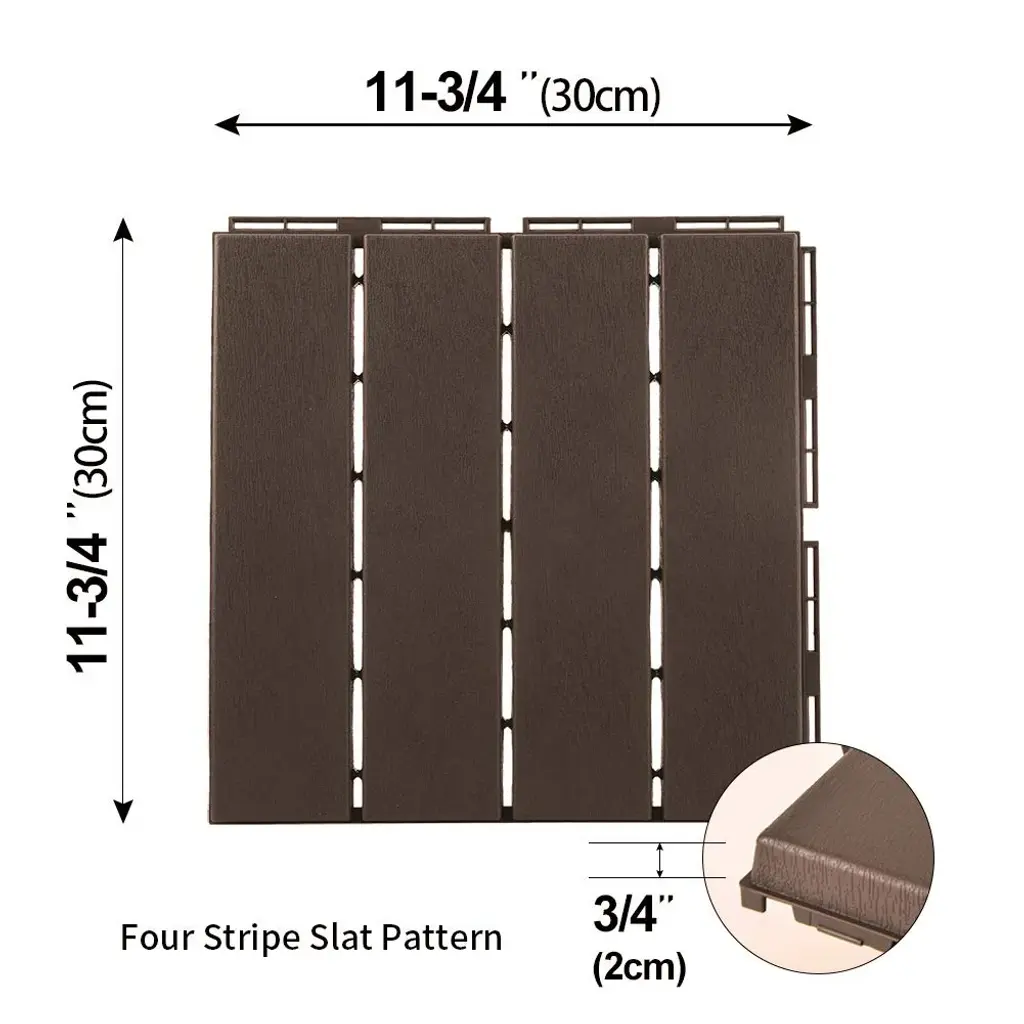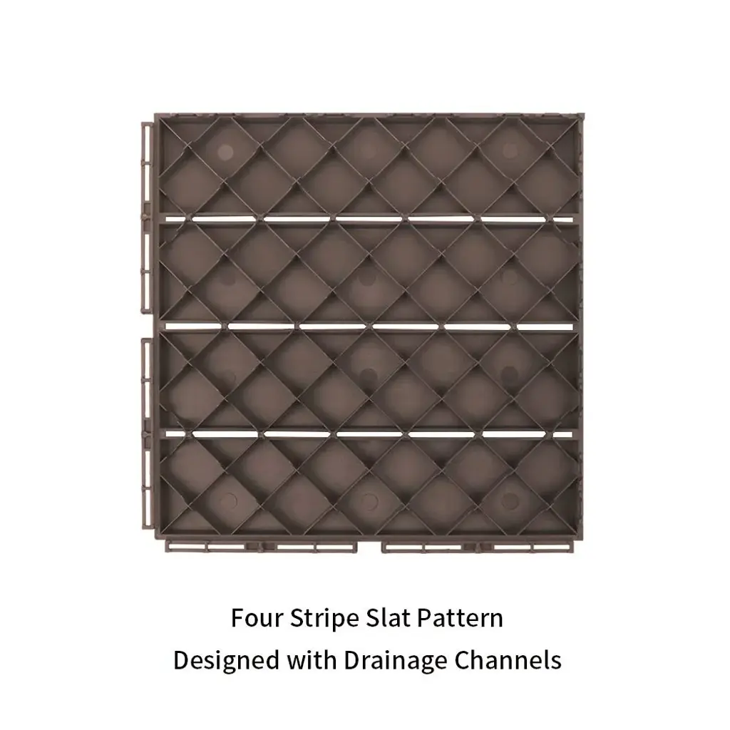 Domi Outdoor Living Patio Deck Tiles – 12" x 12" Composite Interlocking Decking Tiles Upgrade your outdoor space effortlessly with these durable and stylish four-slat plastic deck tiles. Designed for easy installation and long-lasting use, they’re ideal for patios, balconies, porches, and more.Available Options • Colors: Brown, Gray • Sizes: 9-Piece, 27-Piece, 36-Piece, 44-Piece SetsKey Features • Open Drainage Design – The underside features a smart open-grid pattern that promotes water drainage and airflow, helping prevent tile damage and reducing the risk of slipping. • Effortless Snap Installation – No tools, nails, or glue required. The click-together design ensures a quick and secure setup. • Low Maintenance & Waterproof – Lightweight and easy to clean with just a broom or garden hose. Ideal for both hard and semi-hard surfaces. • Versatile Applications – Perfect for enhancing patios, balconies, pool areas, porches, lawns, and more. Also great for creating distinct zones for dining or lounging.Need assistance? Our customer service team is here to help! Whether you have questions about installation, product options, or your order, feel free to contact us—we’ll respond as quickly as possible to ensure a smooth and satisfying experience.