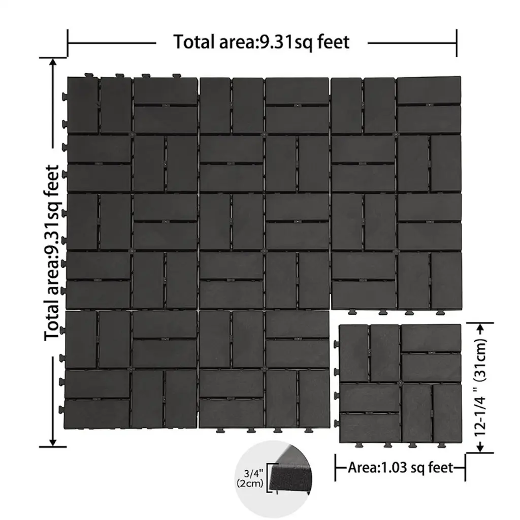 Gulches 44-Pack 12"x12" Composite Deck Tiles: Gray 4-slat plastic flooring with premium, durable material weather-resistant, no warping/rot/cracking. Unique checked design with slat gaps for drainage; open grid aids airflow, preventing slips and damage. Easy interlocking assembly (no nails/glue/tools). Easy to clean (broom/hose); fits patios, poolsides, bathrooms, and more.