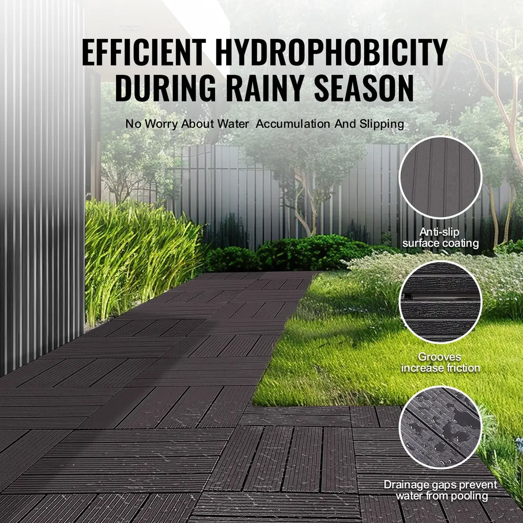 Coverage: For 10 sq. ft. option: Each set includes 10 tiles, measuring 11.8 x 11.8 inches, perfect for outdoor patios, porches, or indoor showers and pet areas. For 36 sq. ft. option: Each set includes 36 tiles, measuring 11.8 x 11.8 inches. For 54 sq. ft. option: Each set includes 56 tiles, measuring 11.8 x 11.8 inches. For 27 sq. ft. option: Each set includes 27 tiles, measuring 11.8 x 11.8 inches. 440 lbs Load Capacity: With a thickness of 0.8 inches, the patio tiles support up to 440 lbs, easily handling heavy items like trucks, bathtubs, sofas, washing machines, and grills. Waterproof and Slip-Resistant: The surface features a special anti-slip coating, with grooves and drainage gaps to ensure quick water runoff during rainy seasons, preventing puddles and slips. Easy to Cut and Install: The quick-connect design allows for easy assembly and disassembly. You can cut tiles to your desired shape, while the cross-patterned backing adds stability and impact resistance. Durable and Low-Maintenance: Made from high-density PP plastic / composite wood plastic, the balcony floor covering is suitable for all seasons, expansion-resistant, easy to clean, and has a wood-like appearance that blends beautifully, perfect for green-minded users. Package Content 10 x Interlocking Deck Tiles / 27 x Interlocking Deck Tiles / 36 x Interlocking Deck Tiles / 54 x Interlocking Deck Tiles