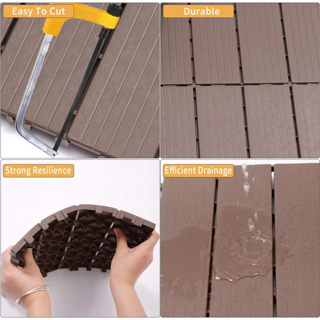 Warm tips: Product after-sales guide 🚀Thank you for purchasing our products!Please do not return the product in case of problems. Please take a photo and send it to us, we will quickly process and provide a reasonable solution. Thank you for your cooperation! 🙏Easy to Install: These deck flooring tiles have an interlocking design base for easy do-it-yourself installation and no tools required for installation.No messy glue, no nails, perfect match and precision spacing between every tile.Unique Design: Our plastic tiles measure 11.8 inches x 11.8 inches x 0.8 inches, with a simple, beautiful design for both indoor and outdoor use. Each plastic tile has a total of 4 slats with a small gap between each slat for easy drainage.INDOOR AND OUTDOOR USABILITY: Interlocking deck tile has a stable base and drains easily. It's perfect for decks, patios, balconies, pool surrounds, saunas, showers, sunrooms, mudrooms, bedrooms and more.High Quality:Our floor tiles are made of high quality plastic material, compared with natural wood, plastic material has the advantages of good water resistance, rot resistance, anti-slip durability and resistance to fading, it is an environmentally friendly product to create a beautiful home.