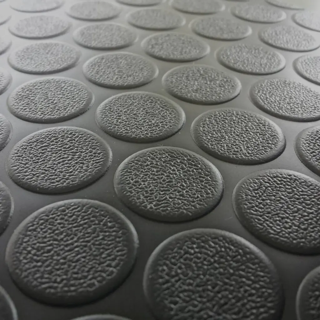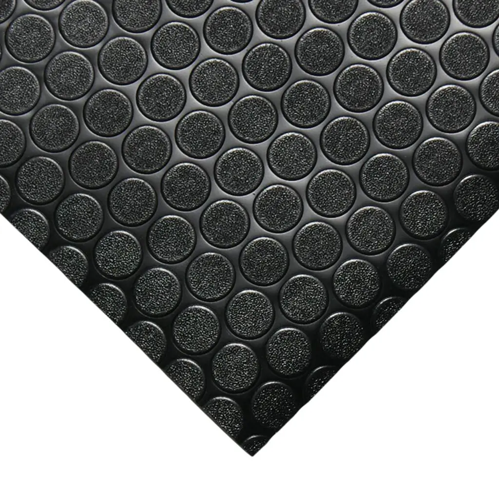 Upgrade your floors with our 2mm thick "Coin-Grip" rubber flooring rolls! Perfect for high-traffic areas, these rolls feature coin-shaped protrusions on the surface that increase traction and reduce the chances of slip-and-fall accidents. The water-proof design is excellent for spaces that are prone to dirt and grime, making it a preferred option over carpeting or wood floors. Our rubber flooring is versatile and can be used in various settings such as commercial gyms, garages, elevators, and even as a van floor liner. Our "Coin-Grip" rubber flooring rolls are made of a blend of SBR and PVC, making them highly mobile and easy to install. With a fabric-textured subsurface, this mat is less likely to skid on floor sub-surfaces. Perfect for modern or industrial settings, our coin rubber flooring is a great investment in safety and style.Features: