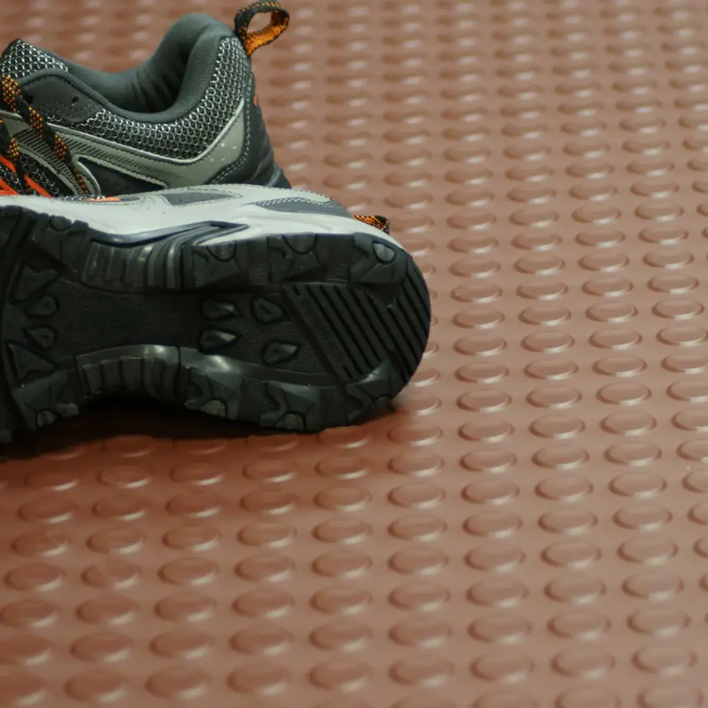 The Coin-Top Thermoplastic Flooring is a durable, anti-slip rubber floor made from thermoplastic elastomer (TPE). The waterproof flooring features a Coin-Top surface pattern of circular, stud-like protrusions that are designed to improve slip-resistance and create a clean, professional aesthetic. The circular studs of this non-slip surfacing act as miniature stepping stones, enhancing traction by providing shoes with additional gripping points. Coin pattern flooring also creates a sleek, modern aesthetic that is perfectly fitting for a range of commercial establishments, from auto-repair shops to restaurants and hospitals. Such locations also favor this TPE rubber flooring for its non-permeable surface and moderate resistance to chemicals. Most mild chemicals and cleaning solutions will have no damaging effect on this coin rubber floor, making it extremely easy to clean and maintain. Thanks to thermoplastic rubber's competitive abrasion and moisture resistances, this coin flooring performs exceptionally well in applications that experience frequent spills and constant foot traffic. The Coin-Top Thermoplastic floors are available in 3 colors - Black, Brown, and Gray - to match virtually any aesthetic theme. The coin pattern rubber floor is also available in varied different factory-cut lengths to ensure a proper fit for any application. Designed for DIY installations, this slip-resistant floor is held down by its own weight for adhesive-free temporary installations. Double-sided carpet tape can be used for more permanent installations. If you'd like even more security in your installation, you can consult a product specialist about using a stronger, polyurethane-based adhesive.