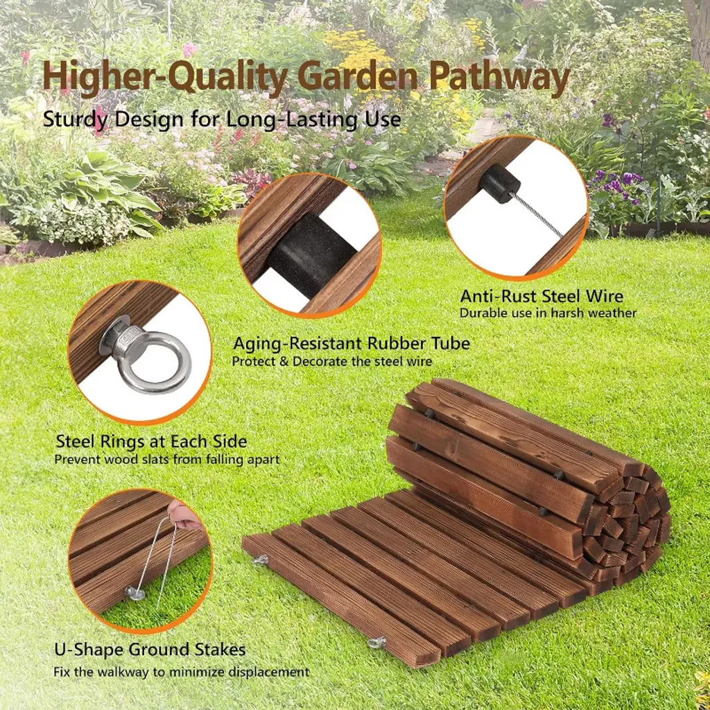 High Quality: Our garden pathway featuring with weather-resistant steel wire and a durable rubber tube protector for long-lasting use. Each side has 2 unique rust-free rings to prevent dislocation and wood slats from falling apart in outdoor use. Stable & Anti-Slip: Coming with 4 U-shaped steel stakes, you can fix the garden pathway into the ground to increase stability. The front side has an anti-slip texture for safety use. Versatile Scenario: The wooden garden pathway is a great addition to the versatile scenario. You can put the walkway in the garden, patio, backyard, wedding, party, or other places and events. The pathway is also ideal for DIY, you can use 1 or more to create a beautiful ornament as you want. Easy to Use & Store: Just easily open the garden pathway in use and put it in the place you prefer. You can roll up the walkway in seconds when not in use and store it in a corner or small space. Premium Material: The garden walkway is made of 100% premium natural fir wood for durable use. The 2.5cm thickness and 22in width are greater than the other walkways which allows long-term and outdoor use.