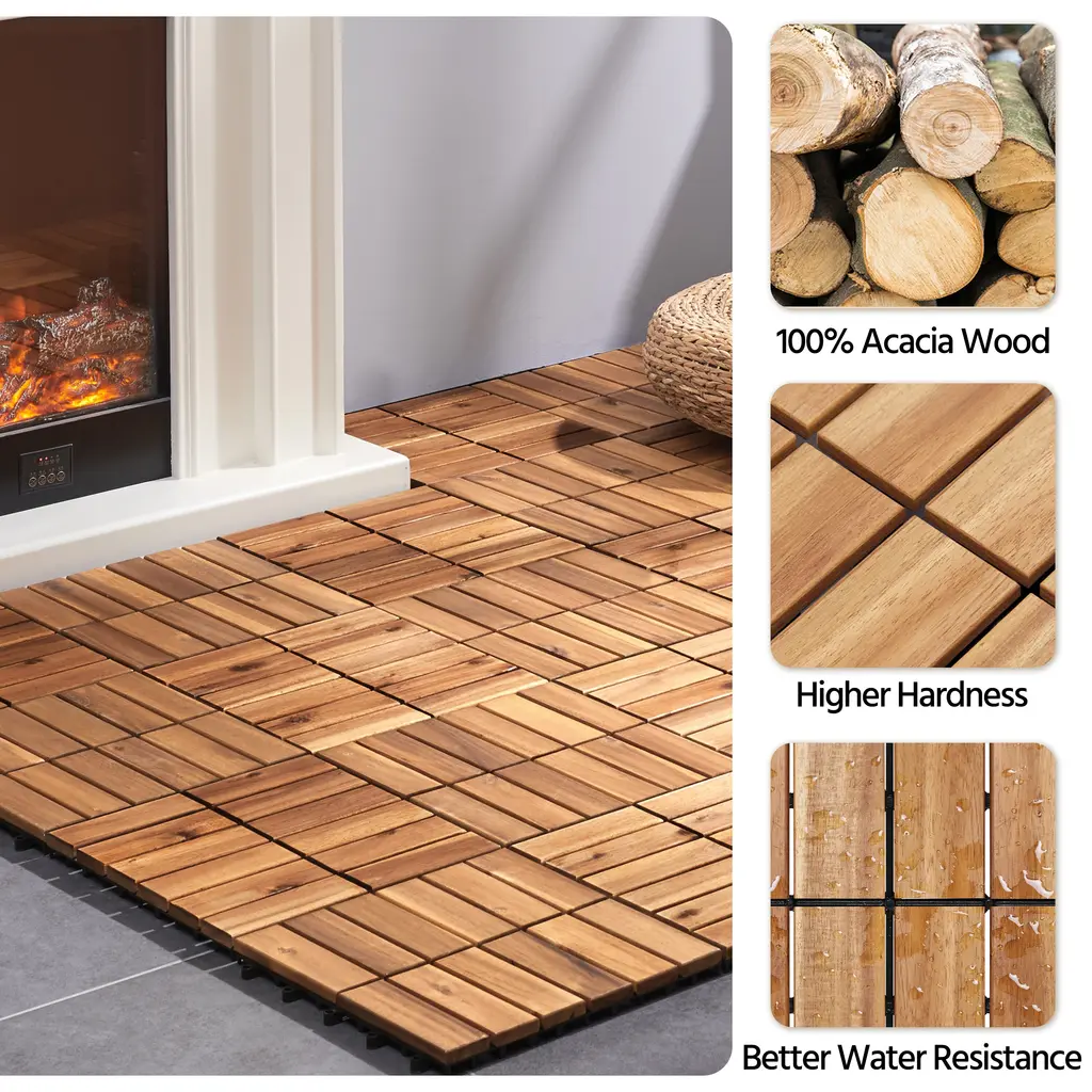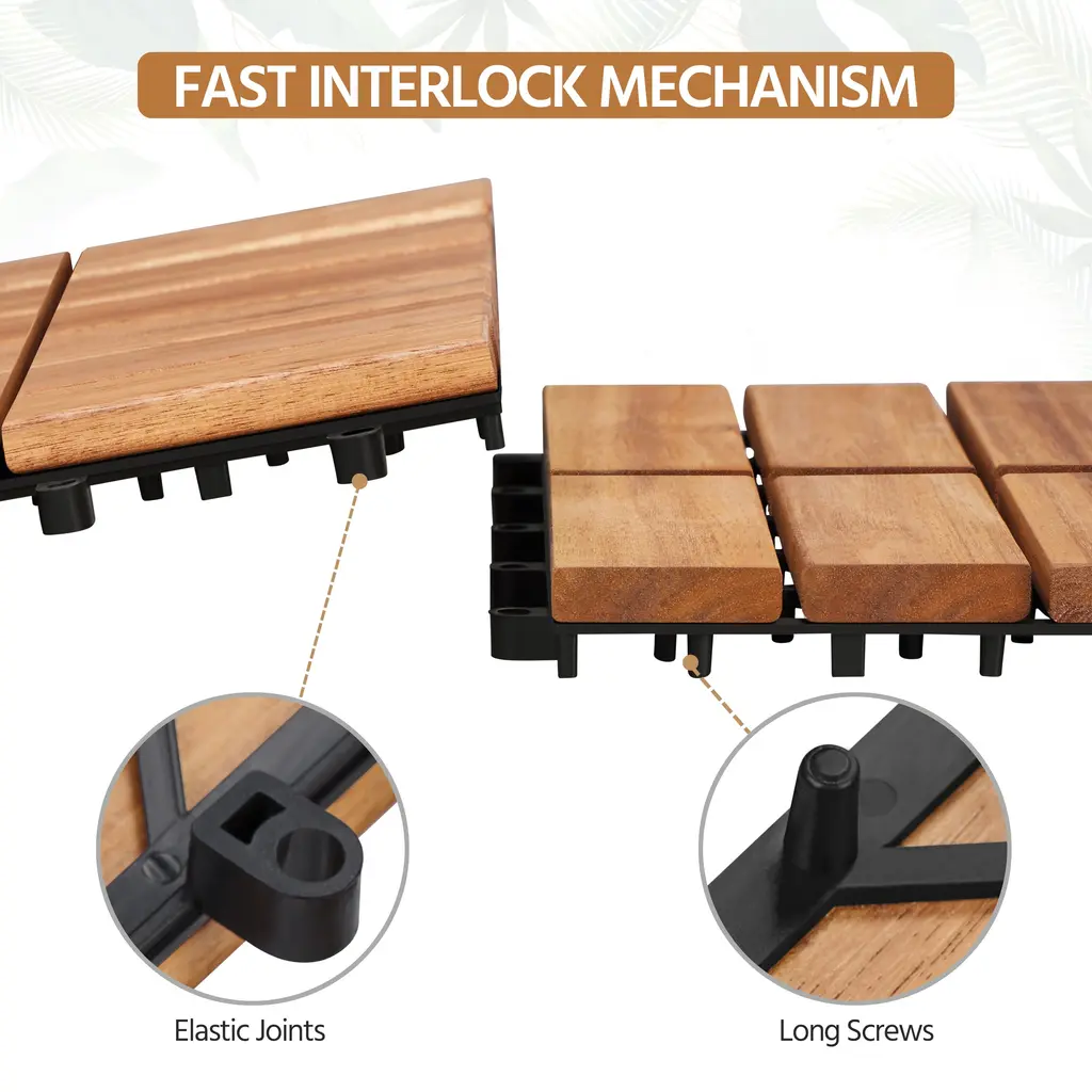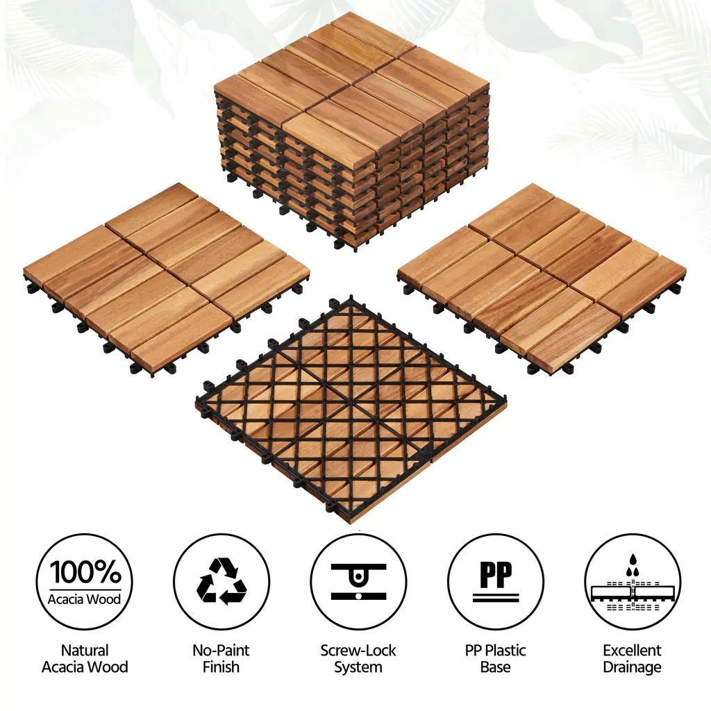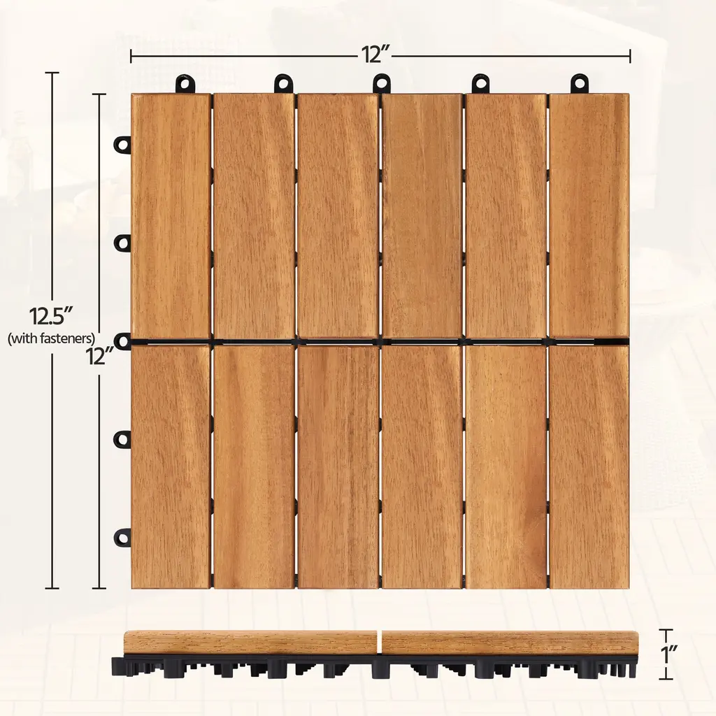Considering a home renovation? Explore the benefits of our natural acacia wood flooring tiles! Crafted from premium acacia wood, these patio pavers are engineered for enduring performance. The thoughtful spacing between each wood slat enhances friction, reducing the risk of slipping—especially in damp conditions. Easily interlocking, these tiles create a seamless raised surface, effectively concealing imidealions on your patio or deck. With their superior quality and durability, they are suitable for various areas including decks, pool surroundings, balconies, gazebos, greenhouses, and more. Features:Specifications:Note: