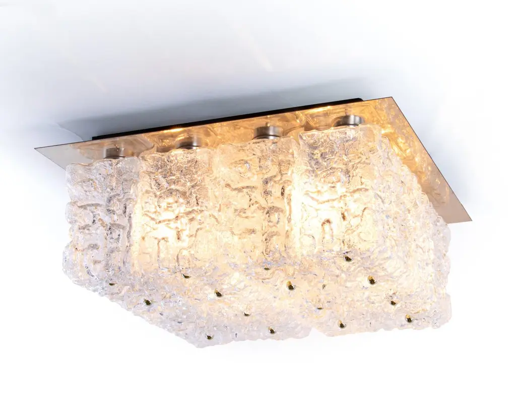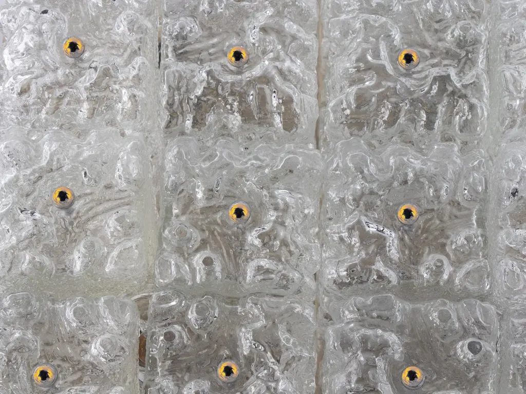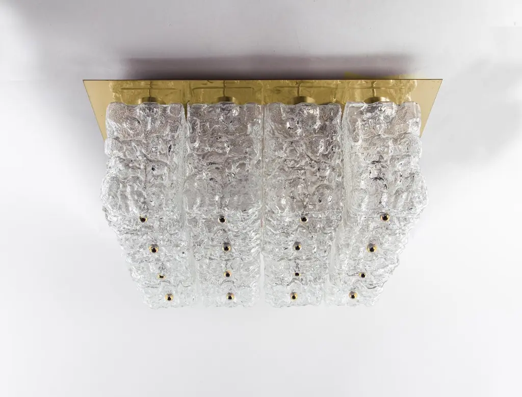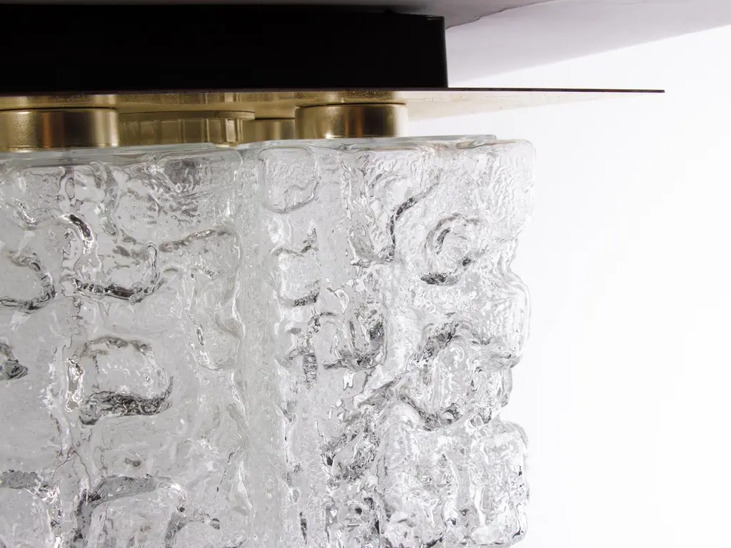 Elegant large cubist flush mount ceiling lamp with sixteen large glass blocks with a textured structure fixed on a golden brass frame with brass finals by the Finnish designer Helena Tynell attr. Gem from the time. Heavy design. Manufactured by Glashutte Limburg, Germany in the 1960s. Design: Helena Tynell attr., Finland. Style: mid century, modernism. Materials: glass and brass. Colors: clear and golden. Manufacturer: Glashutte Limburg, Germany. Year of production: 1960s. Measures: width 19 1/3" in. (49 cm), height 5 1/2“ in. (22 cm). Lighting: takes four large Edison E26/E27 base screw bulbs. Ready to use worldwide. Wattage: we recommend up to 75 watts per bulb. Works on 220v as well as 110v. Condition: very good vintage condition. No imperfections to the glass. Price is per piece. Serveral items in stock. Wiring: the lamp has been tested with US American light bulbs under 120v and works flawlessly, no tools or rewiring required. All our goods are originally wired for 220v. Delivery without bulbs. Shipping: in order to ensure safe transport, the chandelier will be dismantled and carefully packed. We ship worldwide, except to Austria and Denmark.