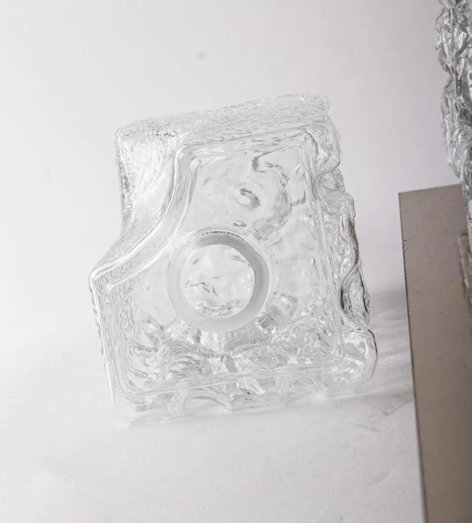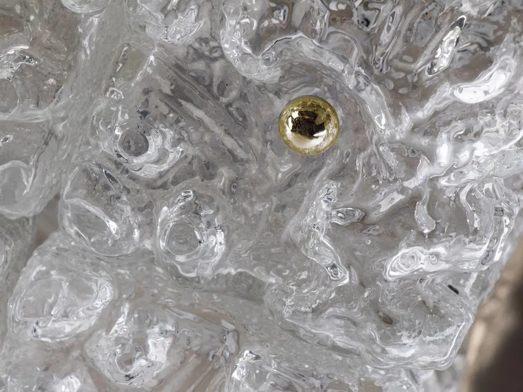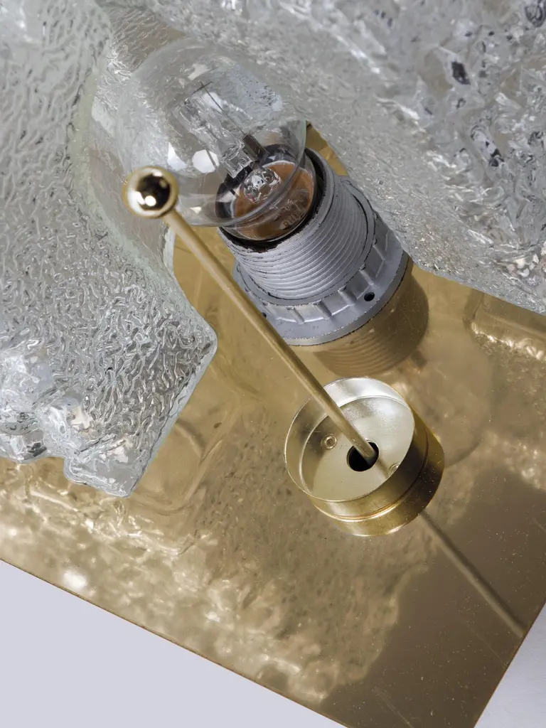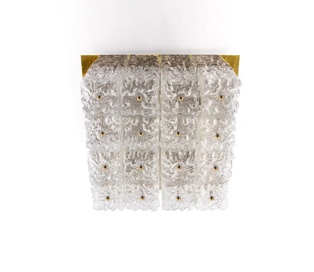 Elegant large cubist flush mount ceiling lamp with sixteen large glass blocks with a textured structure fixed on a golden brass frame with brass finals by the Finnish designer Helena Tynell attr. Gem from the time. Heavy design. Manufactured by Glashutte Limburg, Germany in the 1960s. Design: Helena Tynell attr., Finland. Style: mid century, modernism. Materials: glass and brass. Colors: clear and golden. Manufacturer: Glashutte Limburg, Germany. Year of production: 1960s. Measures: width 19 1/3" in. (49 cm), height 5 1/2“ in. (22 cm). Lighting: takes four large Edison E26/E27 base screw bulbs. Ready to use worldwide. Wattage: we recommend up to 75 watts per bulb. Works on 220v as well as 110v. Condition: very good vintage condition. No imperfections to the glass. Price is per piece. Serveral items in stock. Wiring: the lamp has been tested with US American light bulbs under 120v and works flawlessly, no tools or rewiring required. All our goods are originally wired for 220v. Delivery without bulbs. Shipping: in order to ensure safe transport, the chandelier will be dismantled and carefully packed. We ship worldwide, except to Austria and Denmark.