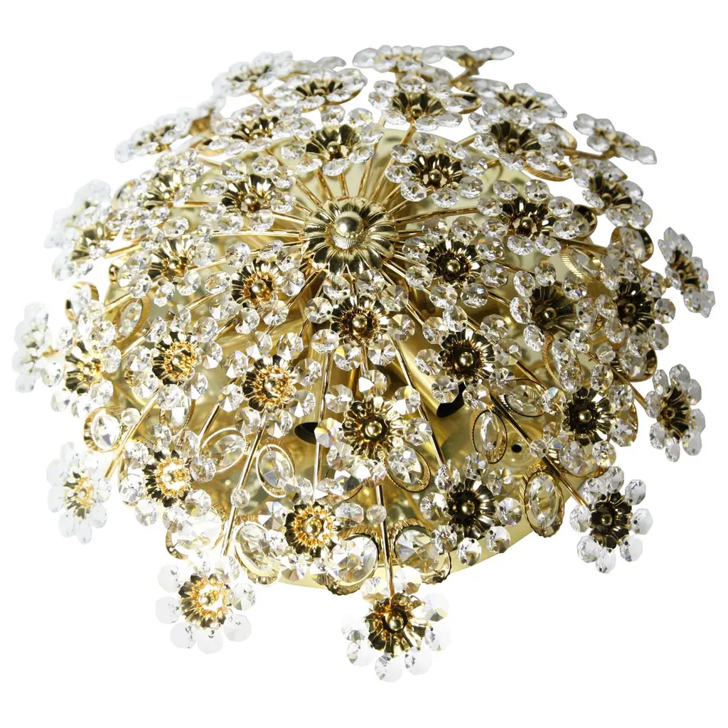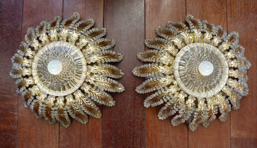Pair of brass glass and crystal glass bead palm leave flush mount lights, Italy, 1970s. High quality and in very good condition.Each light requires 5 x E14 Standard bulbs with 40W max each and compatible with the US/UK/ etc .. standards. 2 Pieces are available.Please note that price is per item not for the set.