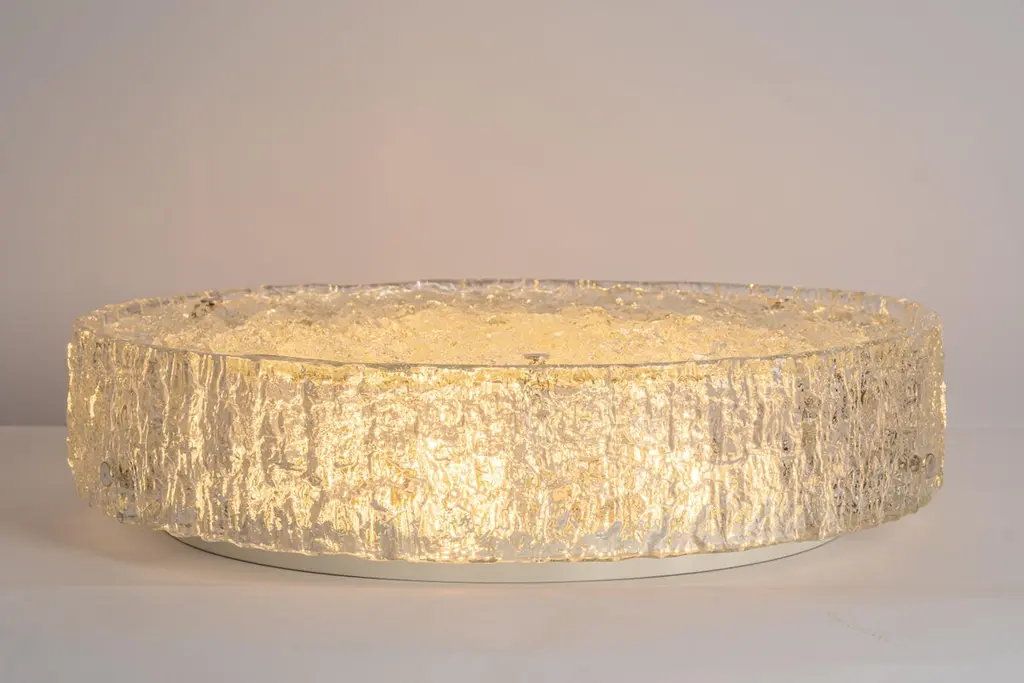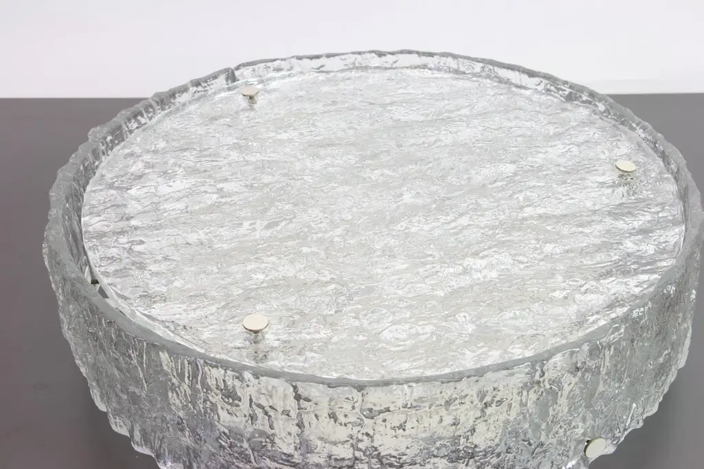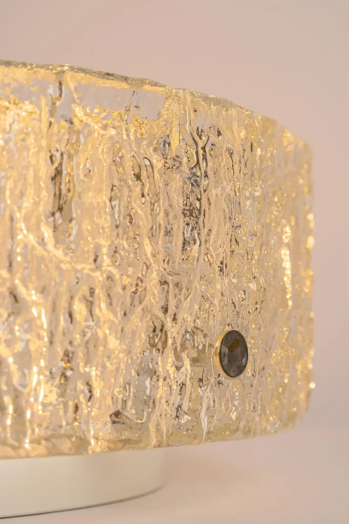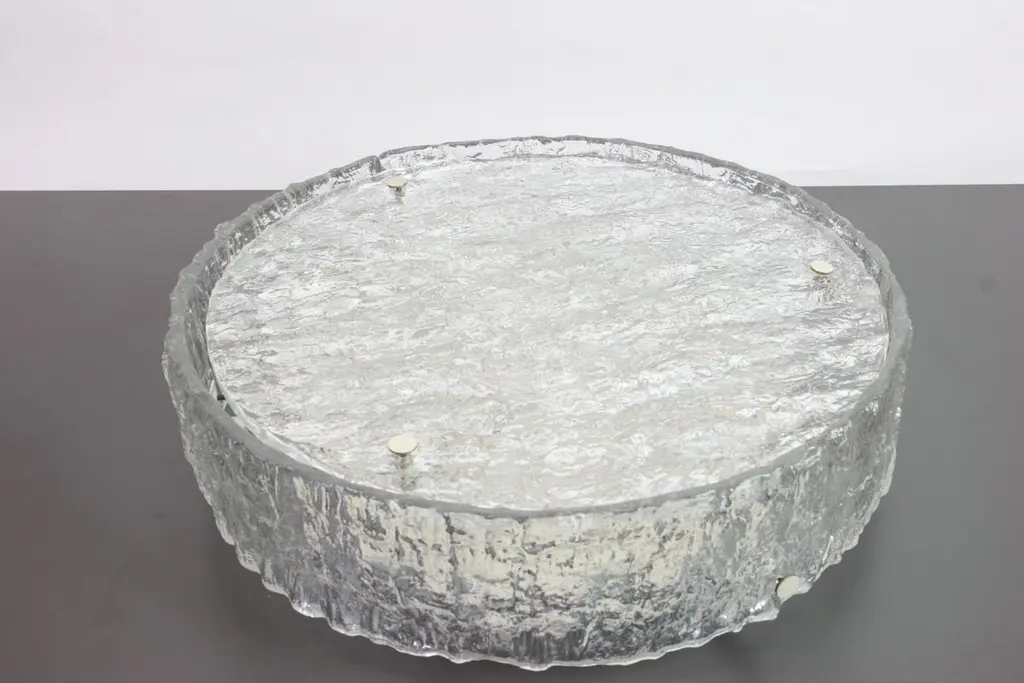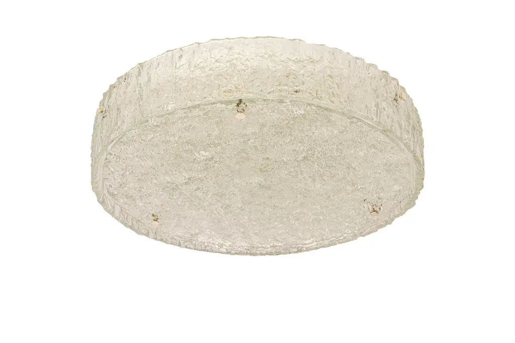 Gorgeous extra large two-part drum-shaped flush mount chandelier with one ring outside and a flat disc made of heavy textured clear iced glass on a white metal frame with nickel finals. Manufactured by Kaiser Lighting, Germany in the 1960s. Measures: diameter 23 5/8" in. (60 cm) x height 5.5" in. (14 cm). Sockets: 5 x E27 bulbs (max. 60 watts each)Light bulbs are not included. It is possible to install this fixture in all countries (US, UK, Europe, Asia, Australia.)Wattage: we recommend up to 40w per bulb. Works on 220v as well as 110v. Condition: excellent vintage condition. No imperfections in the glass. Two items are left in stock. The listed price is for one item.Wiring: the lamp has been tested with US American light bulbs under 120v and works flawlessly; no tools or rewiring required. All our goods are originally wired for 220v. Delivery without bulbs.