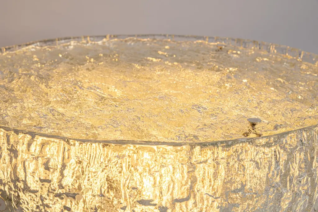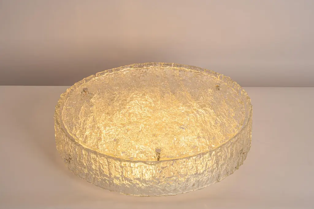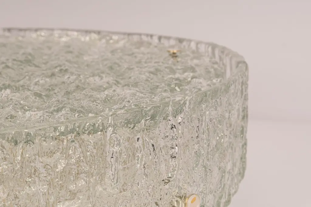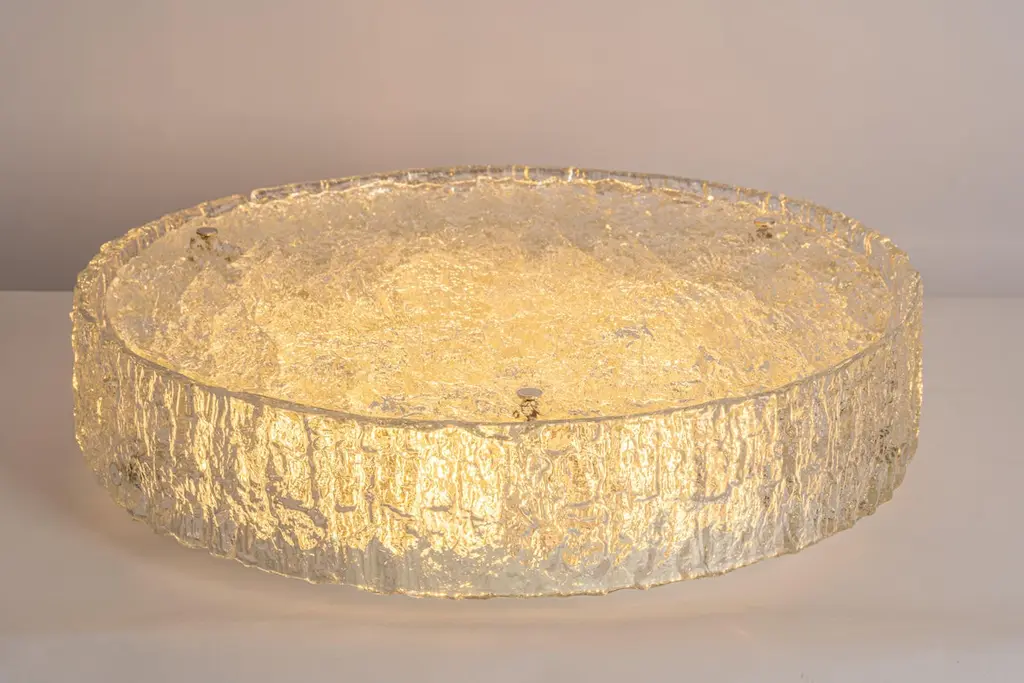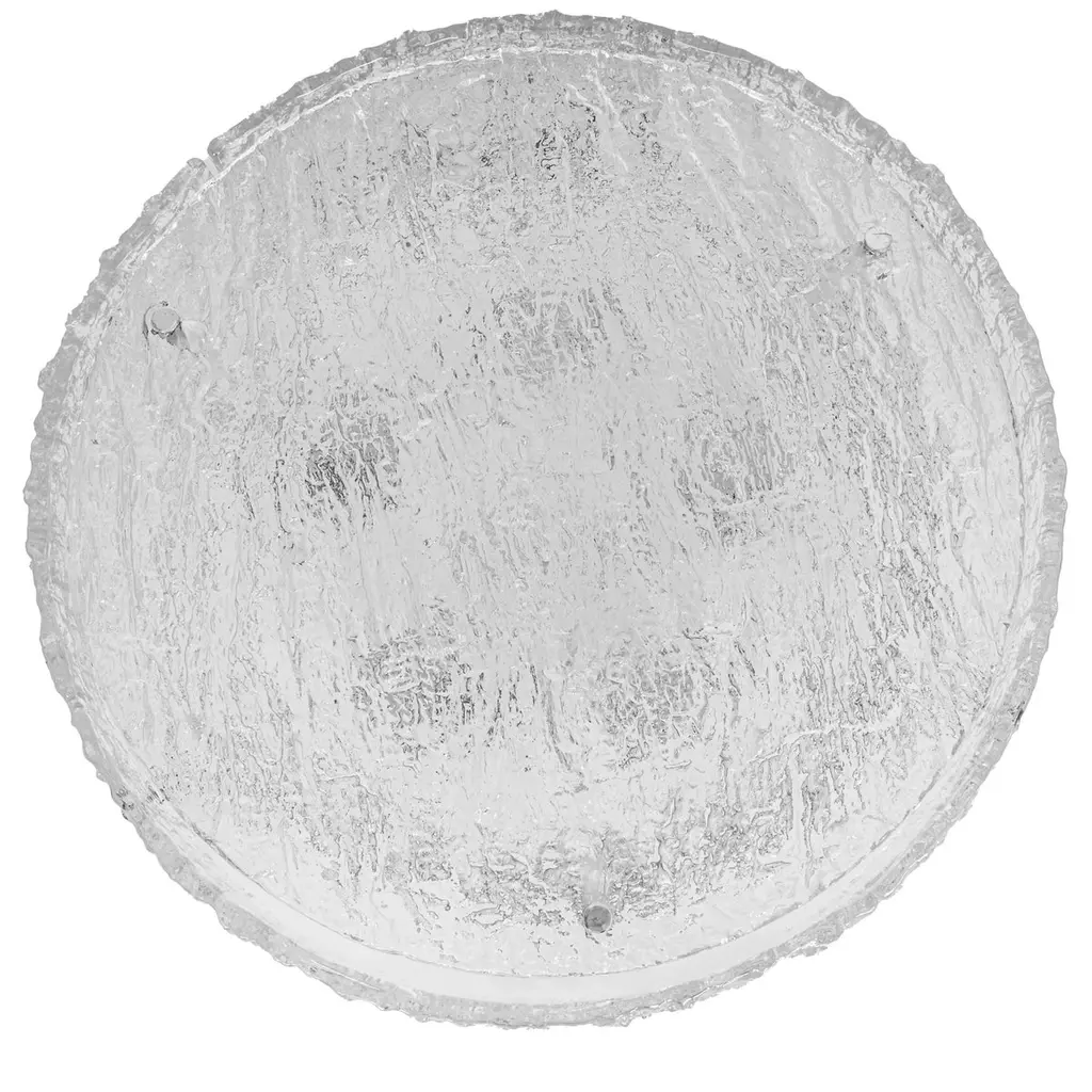 Gorgeous extra large two-part drum-shaped flush mount chandelier with one ring outside and a flat disc made of heavy textured clear iced glass on a white metal frame with nickel finals. Manufactured by Kaiser Lighting, Germany in the 1960s. Measures: diameter 23 5/8" in. (60 cm) x height 5.5" in. (14 cm). Sockets: 5 x E27 bulbs (max. 60 watts each)Light bulbs are not included. It is possible to install this fixture in all countries (US, UK, Europe, Asia, Australia.)Wattage: we recommend up to 40w per bulb. Works on 220v as well as 110v. Condition: excellent vintage condition. No imperfections in the glass. Two items are left in stock. The listed price is for one item.Wiring: the lamp has been tested with US American light bulbs under 120v and works flawlessly; no tools or rewiring required. All our goods are originally wired for 220v. Delivery without bulbs.