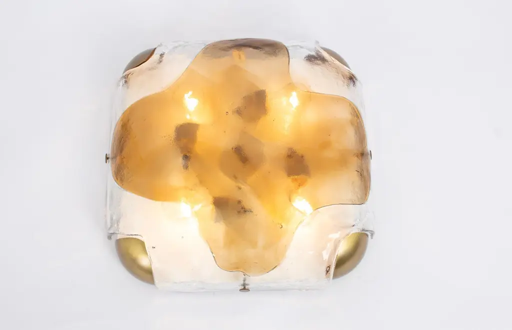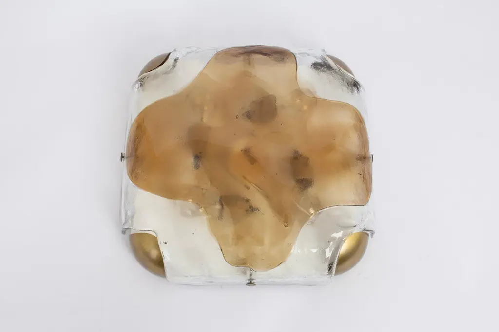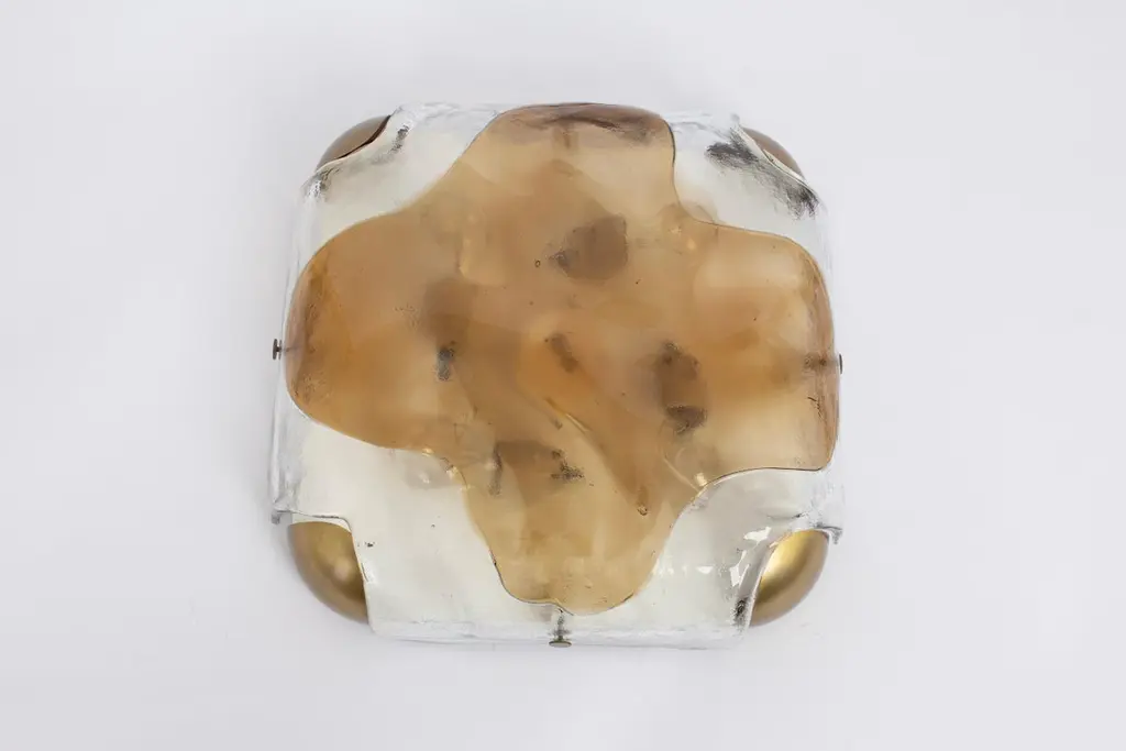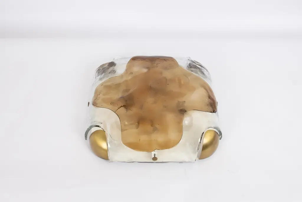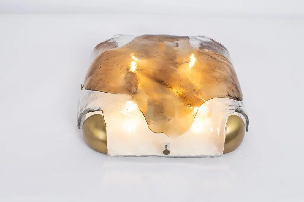 A wonderful Murano glass flush mount by kaiser, Germany, 1970s.Thick textured Glass fixtured on a metal and brass base.High quality and in very good condition. Cleaned, well-wired, and ready to use. The fixture requires 4 x E27 standard bulbs with 60W max each.Light bulbs are not included. It is possible to install this fixture in all countries (US, UK, Europe, Asia, Australia,..)Please note that the price listed is for one item.Two Items are available.