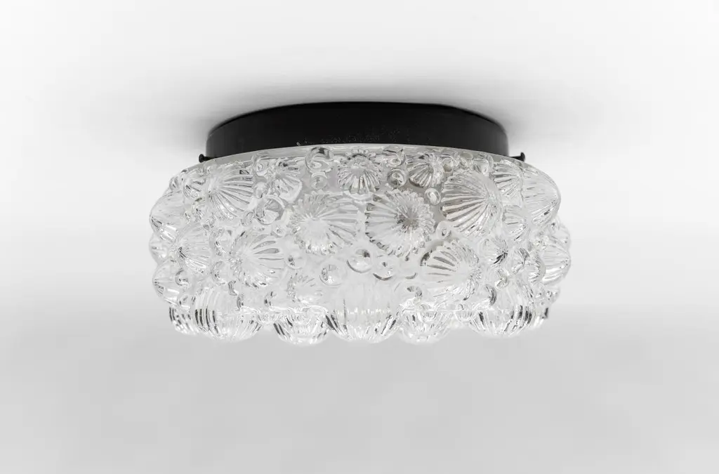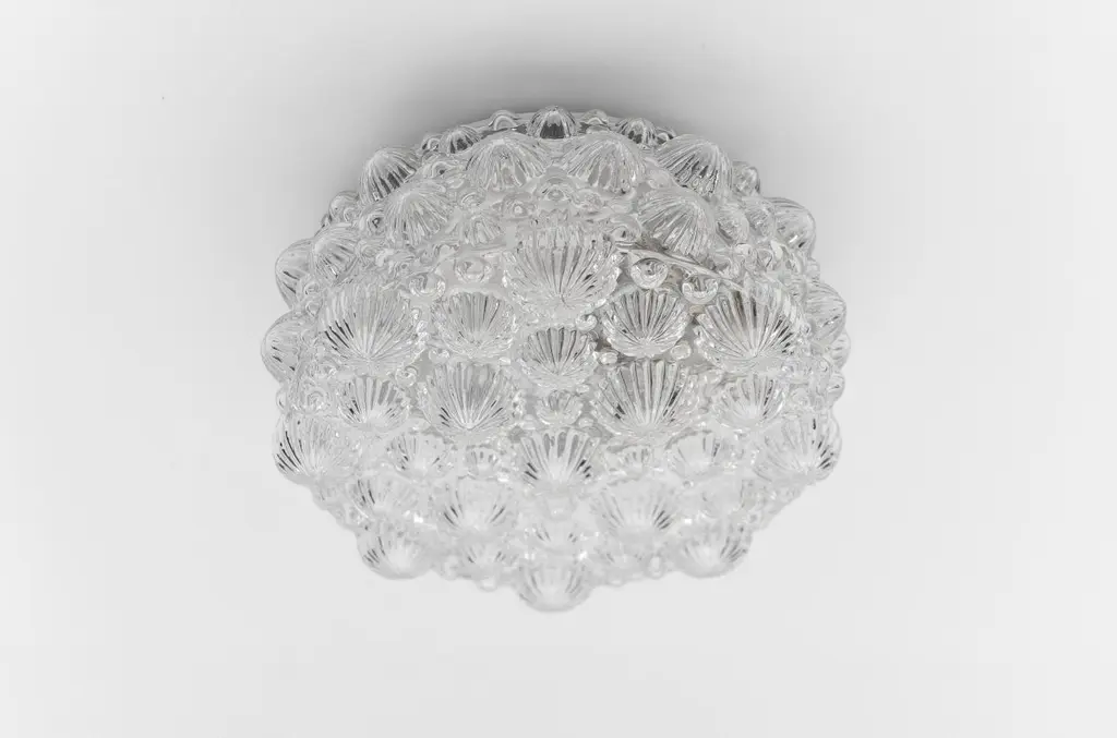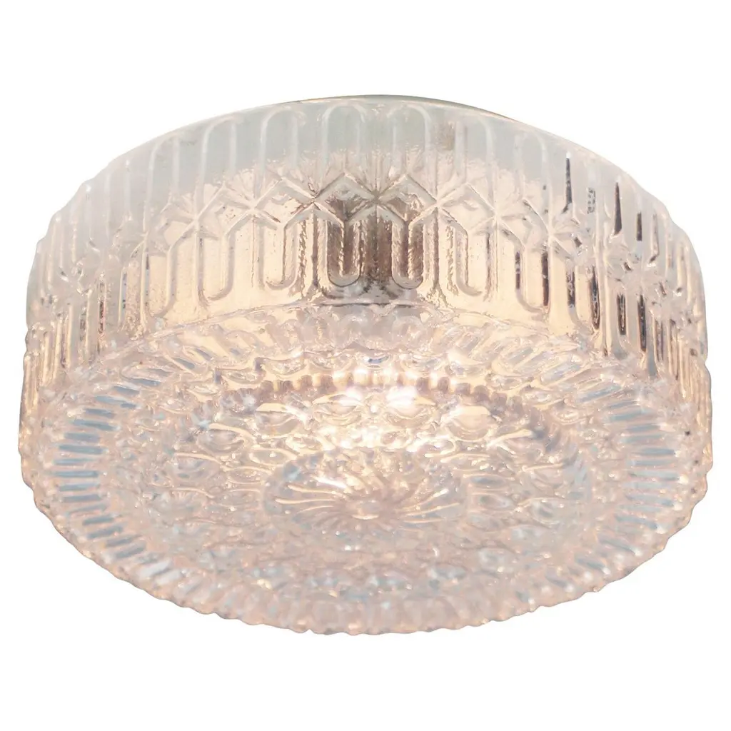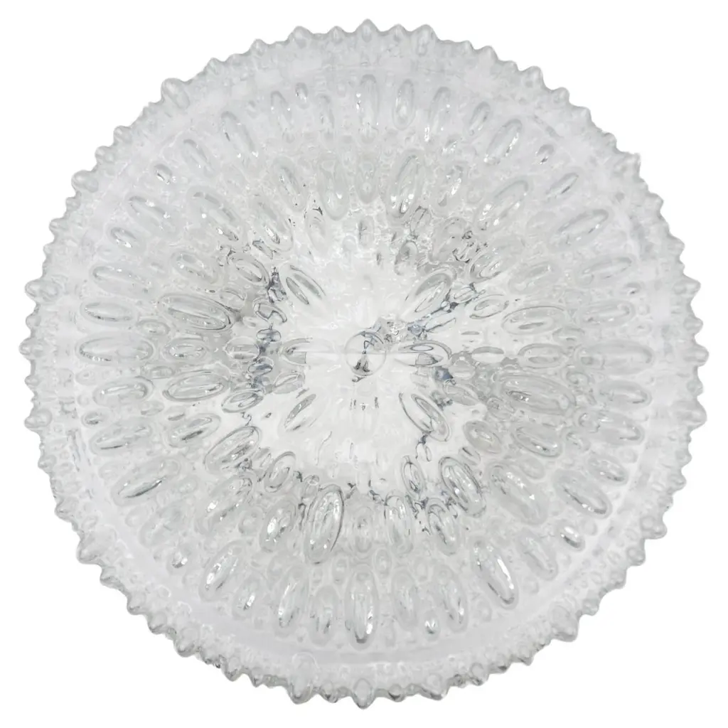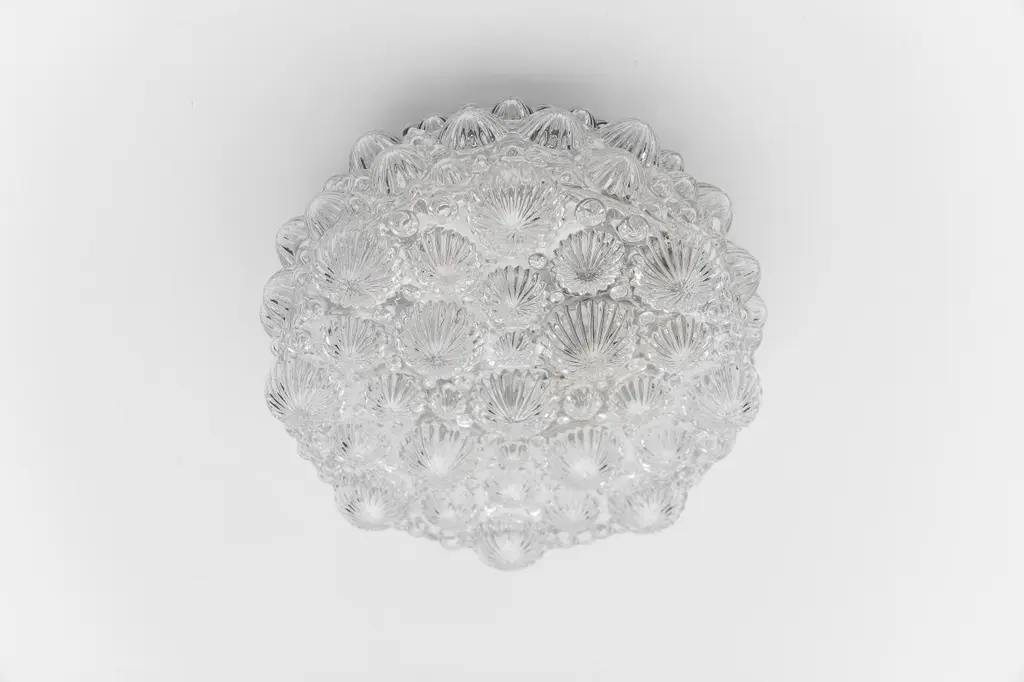 1. of 2 Round Mid-Century Modern 3D Fossil Shell Shape Flush Mount Lamp, 1960s Executed in ice glass and metal. This lamp need 1 x E14 / E15 Edison screw fit bulb is wired, in working condition and runs both on 110 / 230 volt. Dimmable.Our lamps are checked, cleaned and are suitable for use in the USA.