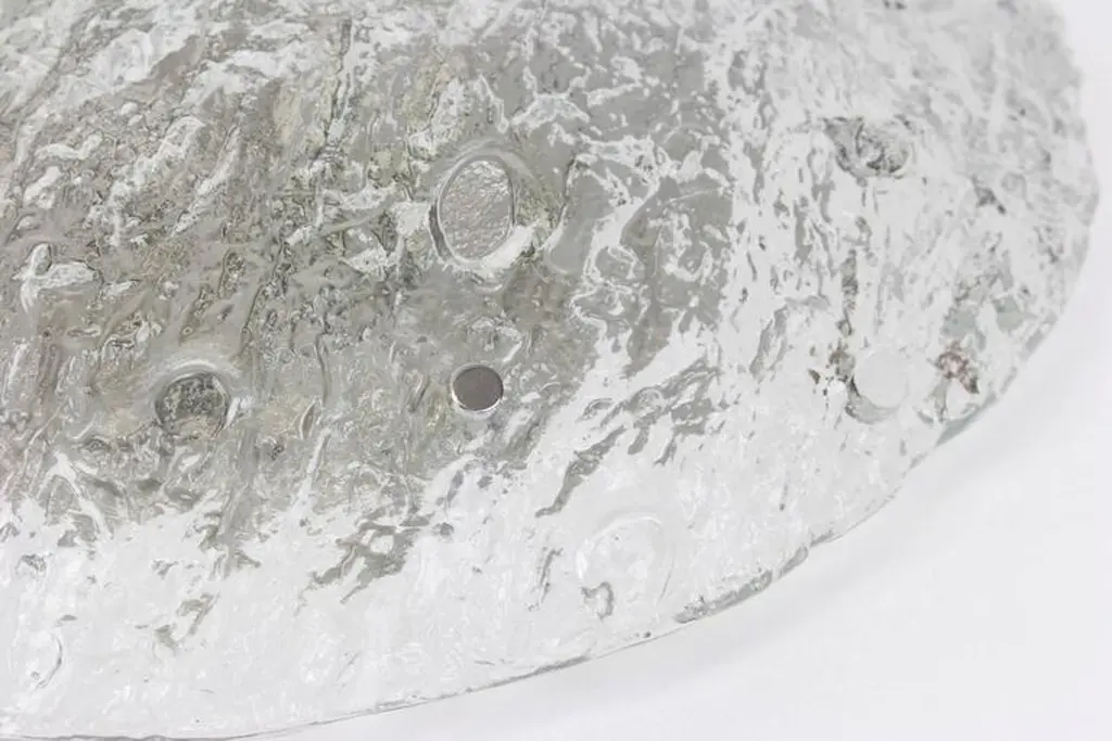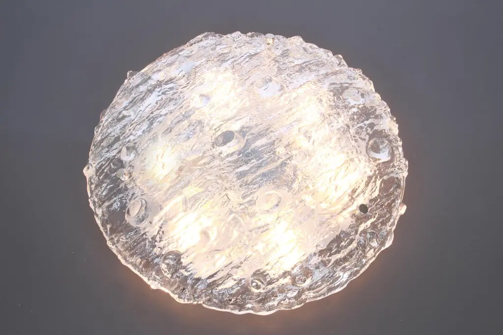 A wonderful Murano glass flush mount light made Josef Brumberg, Germany, 1970s.Thick textured Murano Glass fixtured metal base with three chrome holders.High quality and in very good condition. Cleaned, well-wired, and ready to use. The fixture requires 6 x E14 small bulbs with 40W max each.Light bulbs are not included. It is possible to install this fixture in all countries (US, UK, Europe, Asia, Australia,..)Please note that the price listed is for one item.Two items are available.
