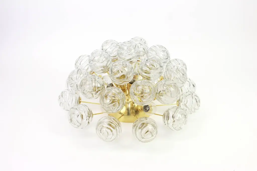 Spectacular Sputnik flush mount with glass snowballs designed by Doria, Germany, 1970s.All glass balls are in good condition.It needs 12 small size bulbs (E-14 bulbs) up to 40 watts each and is compatible with the US /UK/ .. Standards.2 items are available.