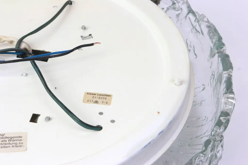 A wonderful round ice glass flushmount manufactured by Kaiser Leuchten in Germany, 1970s.Thickly textured ice glass fixture on a white metal base with three chrome holders.High quality and in very good condition. Cleaned, well-wired and ready to use. The fixture requires 4 standard bulbs and is compatible with the US/UK/ etc, standards.The listed price is for one item.3 items are available.