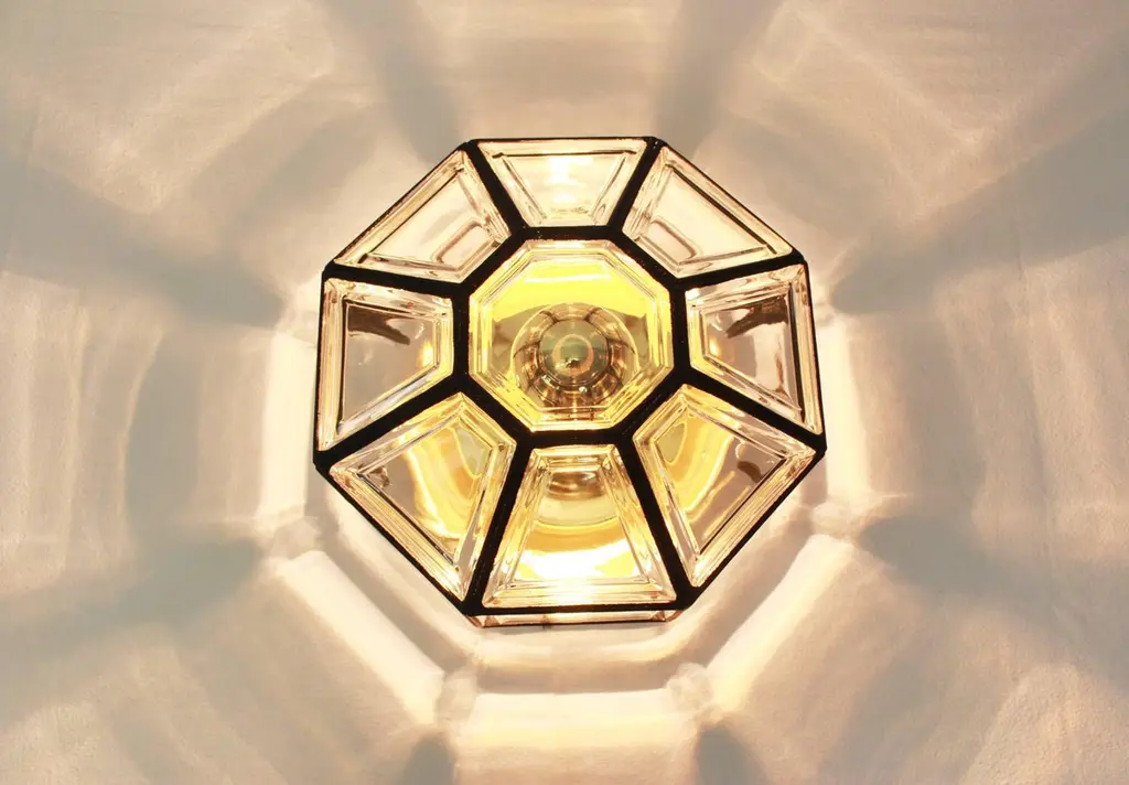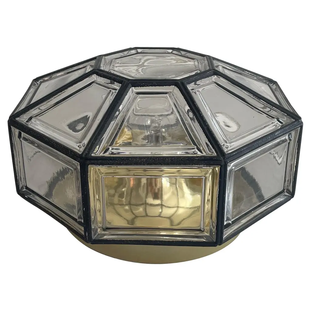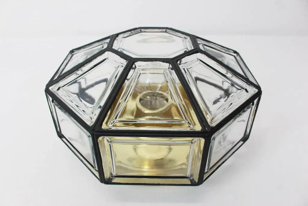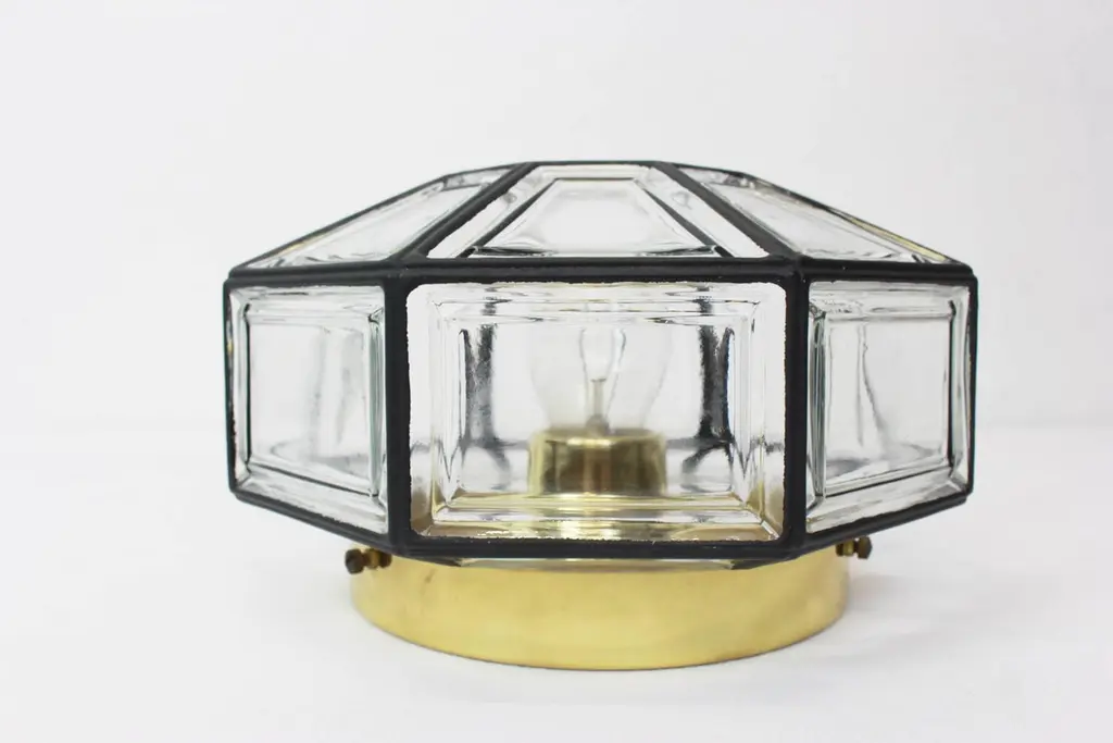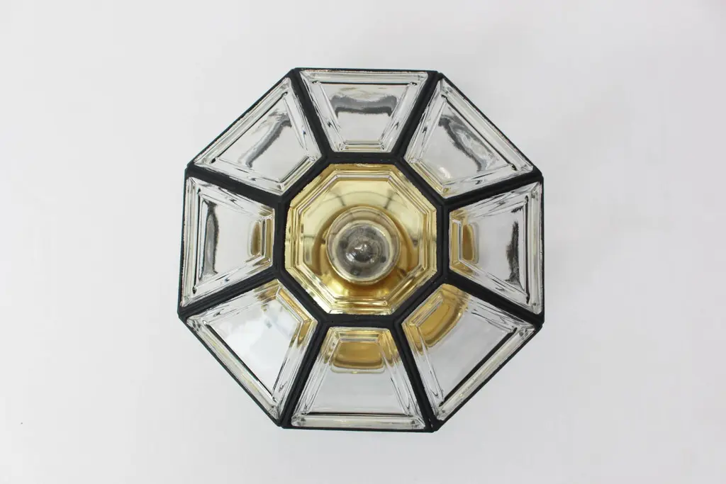 1 of 3 Minimalist iron and clear glass flushmount manufactured by Limburg Glashütte, Germany, circa 1960-1969. Octagonally shaped lantern and multifaceted clear glass.High quality and in very good condition. Cleaned, well-wired and ready to use. Each fixture requires one standard bulbLight bulbs are not included. It is possible to install this fixture in all countries (US, UK, Europe, Asia, Australia,..)3 pieces are available. Please note that the listed price is for one piece.
