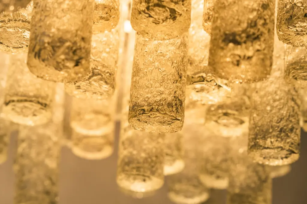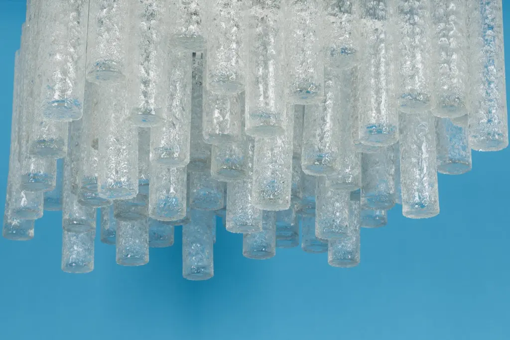 Fantastic big midcentury chandelier by Doria, Germany, manufactured circa 1960-1969. Many Murano glass cylinders are suspended from the fixture.Wonderful geometric design.High quality and in very good condition. Cleaned, well-wired and ready to use. The fixture requires 6 standard bulbs.Light bulbs are not included. It is possible to install this fixture in all countries (US, UK, Europe, Asia, Australia,..)Dimensions:Diameter 48 cm / 18.9 inches Height 34 cm / 13.4 inchesThe listed price is for one item.Five items are available.