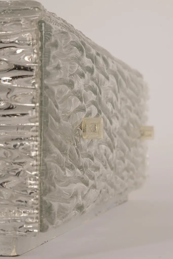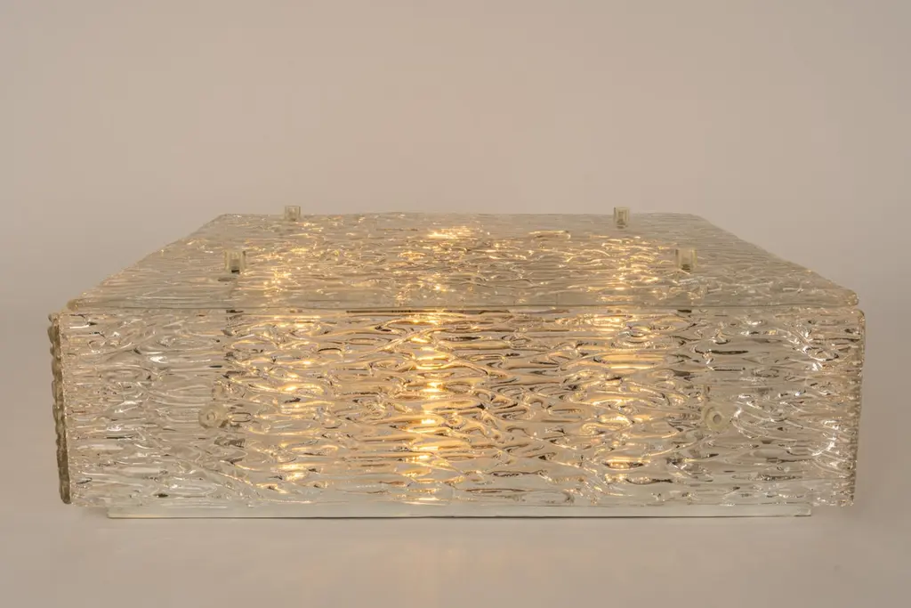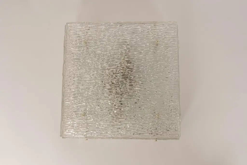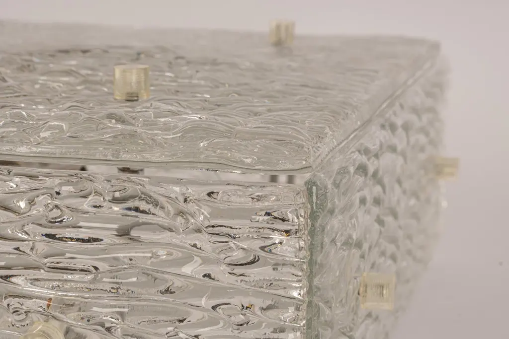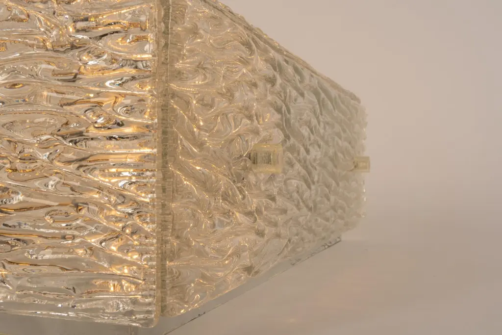 A stunning flush mount light by Kalmar, Austria, manufactured in the 1960s.The flush mount is composed of five thick textured Murano glass elements attached to a white metal frame.Heavy quality and in very good condition. Cleaned, well-wired, and ready to use. The fixture requires four E27 Standard bulbs with 60W max each.Light bulbs are not included. It is possible to install this fixture in all countries (US, UK, Europe, Asia, Australia,..)Three items are available.The listed price is for one item.