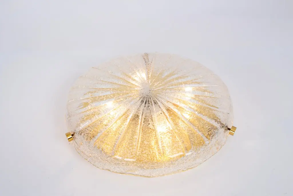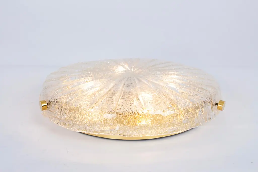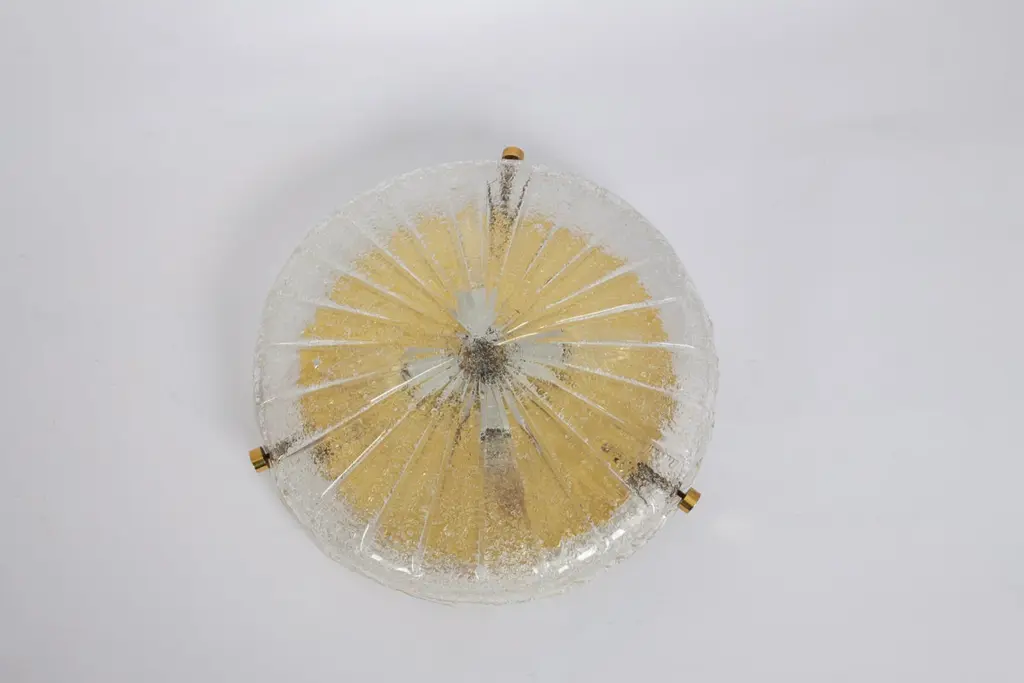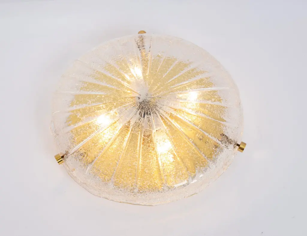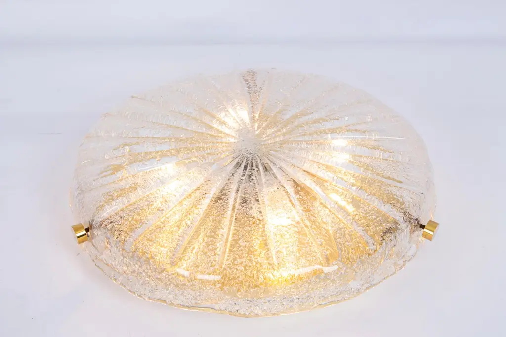 A wonderful round Murano Flush Mount by Hillebrand Leuchten, Germany, 1970s.Thick textured Murano fixture on a brass base with 3 brass screws.High quality and in very good condition. Cleaned and well-wired.The fixture requires 4 x E14 small bulbs with 40W max eachLight bulbs are not included. It is possible to install this fixture in all countries (US, UK, Europe, Asia, Australia,..)Dimensions:Diameter: 41 cm Depth: 7 cmPlease note that the price listed is per item.Three items are available.