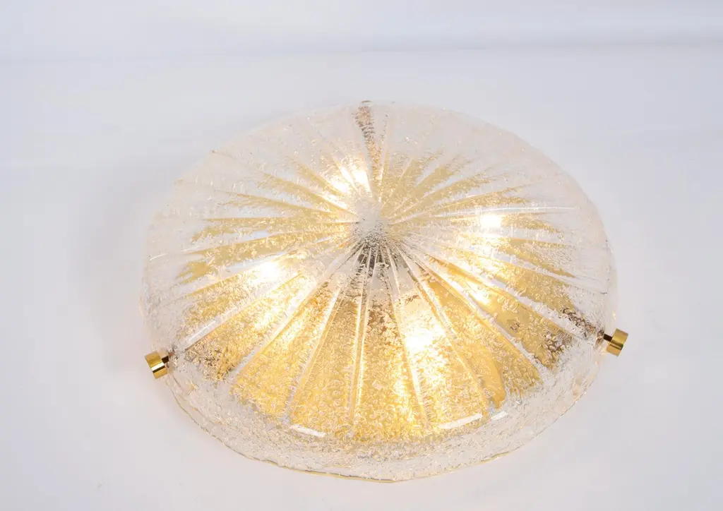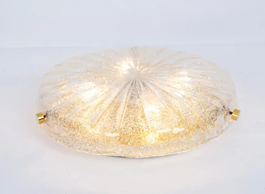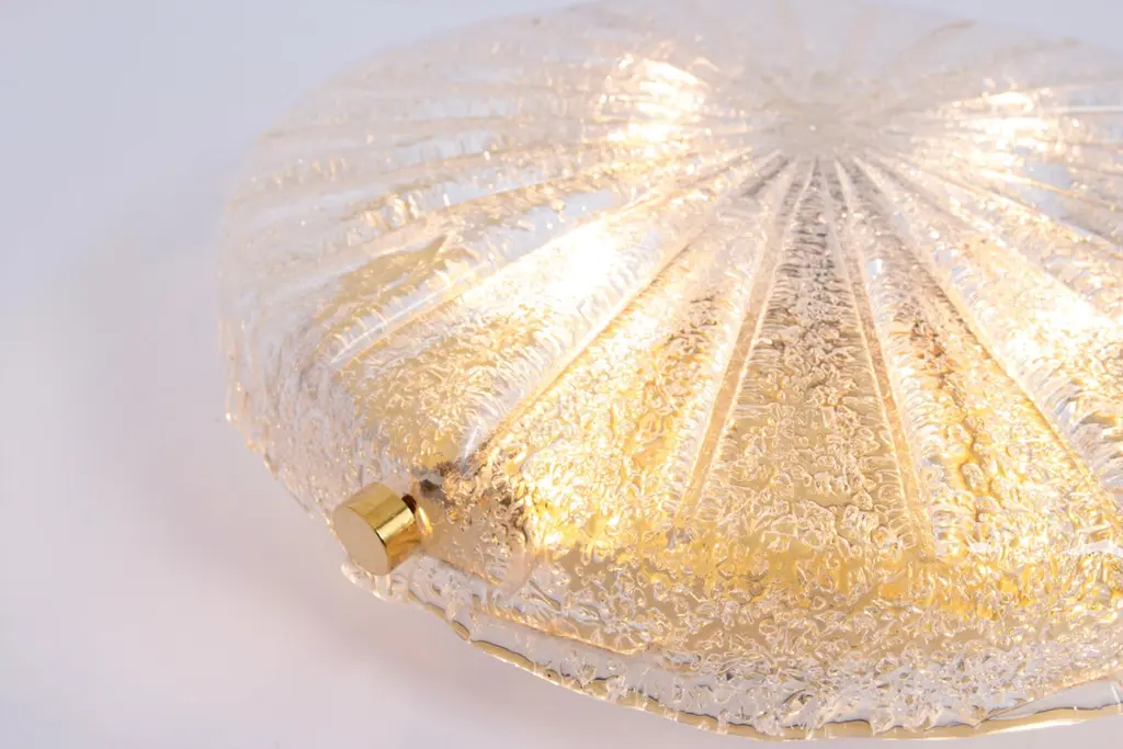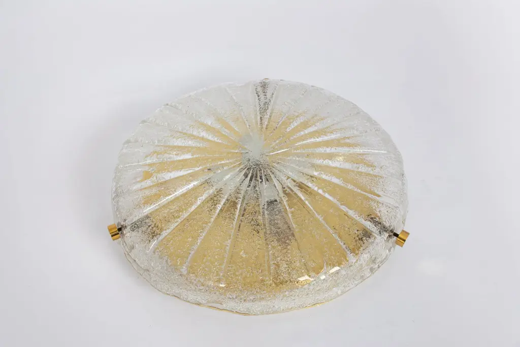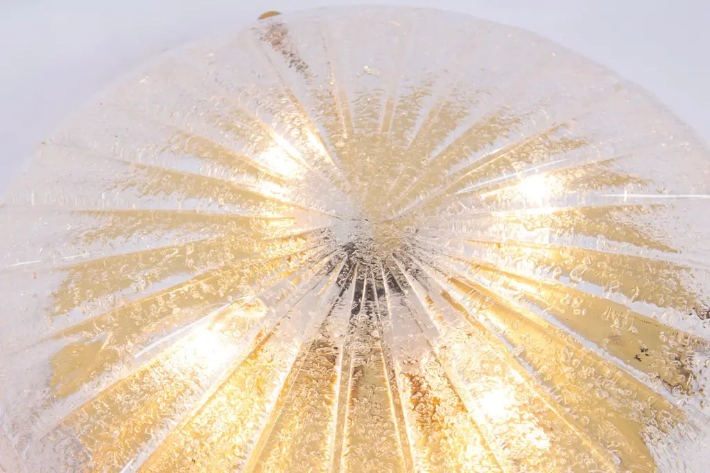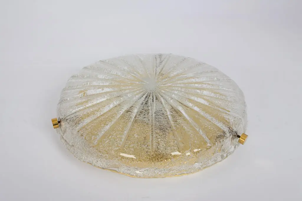 A wonderful round Murano Flush Mount by Hillebrand Leuchten, Germany, 1970s.Thick textured Murano fixture on a brass base with 3 brass screws.High quality and in very good condition. Cleaned and well-wired.The fixture requires 4 x E14 small bulbs with 40W max eachLight bulbs are not included. It is possible to install this fixture in all countries (US, UK, Europe, Asia, Australia,..)Dimensions:Diameter: 41 cm Depth: 7 cmPlease note that the price listed is per item.Three items are available.