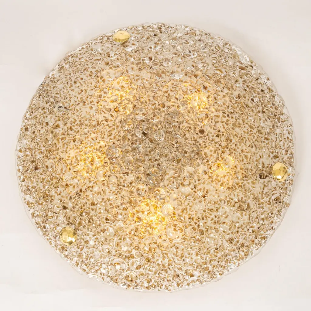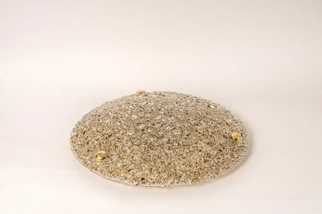 A wonderful round murano flushmount by Hillebrand Leuchten, Germany, 1970s.Thick textured Amber Murano fixture on a white metal base with three brass screws.High quality and in very good condition. Cleaned, well-wired and ready to use. The fixture requires 5 x E14 small bulbs with 40W max eachLight bulbs are not included. It is possible to install this fixture in all countries (US, UK, Europe, Asia, Australia,..)Please note that the price listed is per item.4 Items are available.