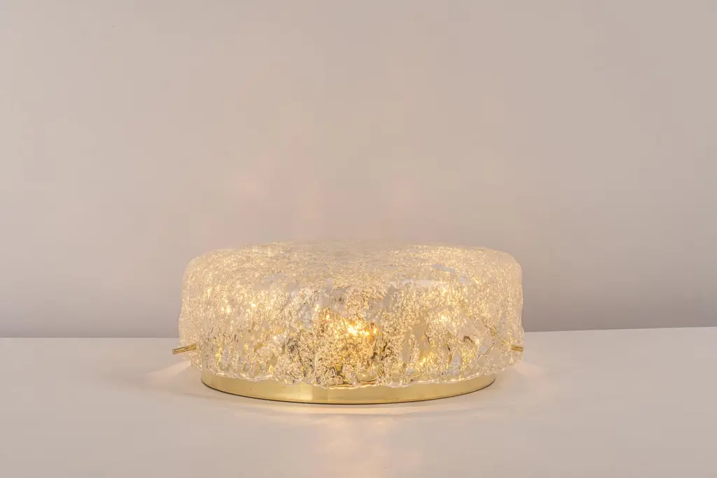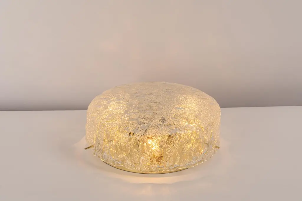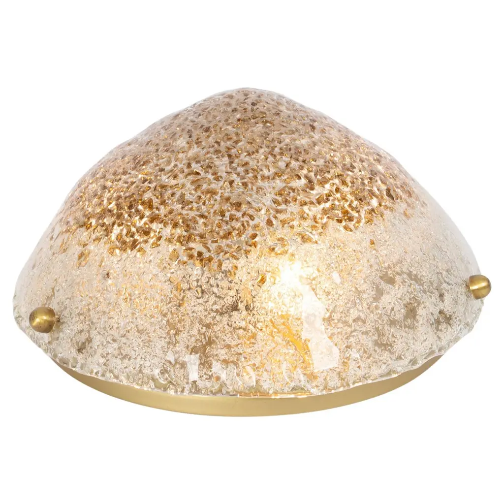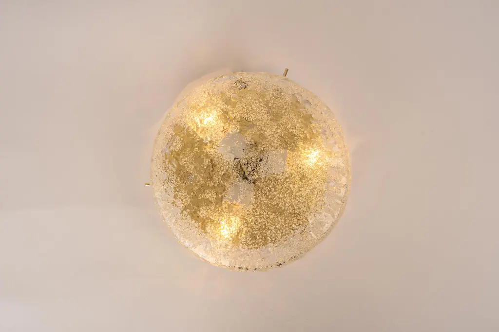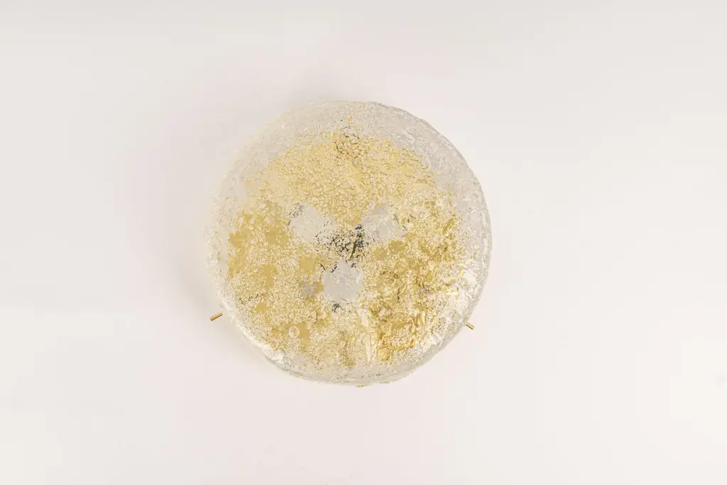 A round textured Murano glass ceiling mount fixture with brass backplate and hardware by Hillebrand Leuchten, Germany, circa 1970s.Sockets: Three x E27 standard bulbsLight bulbs are not included. It is possible to install this fixture in all countries (US, UK, Europe, Asia, Australia,..)Very good condition.The listed price is for one item.4 items are available.